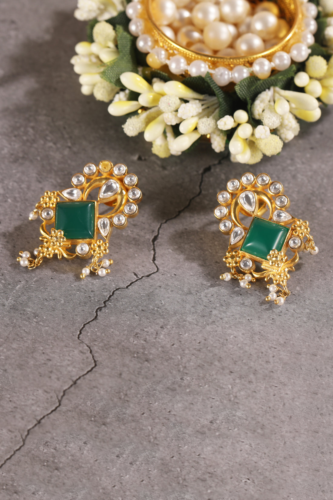 Introducing 'Avni' earrings—a small yet extravagant design in royal gold with a rich green accent....
