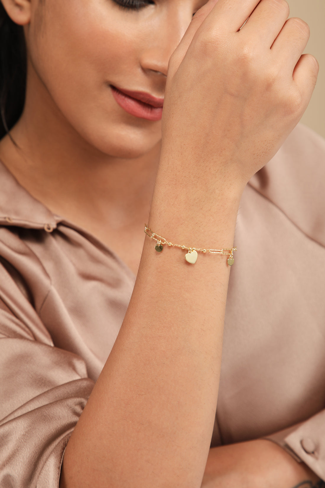 Golden Affection: A trendy link chain bracelet adorned with dainty golden heart charms. Crafted in...