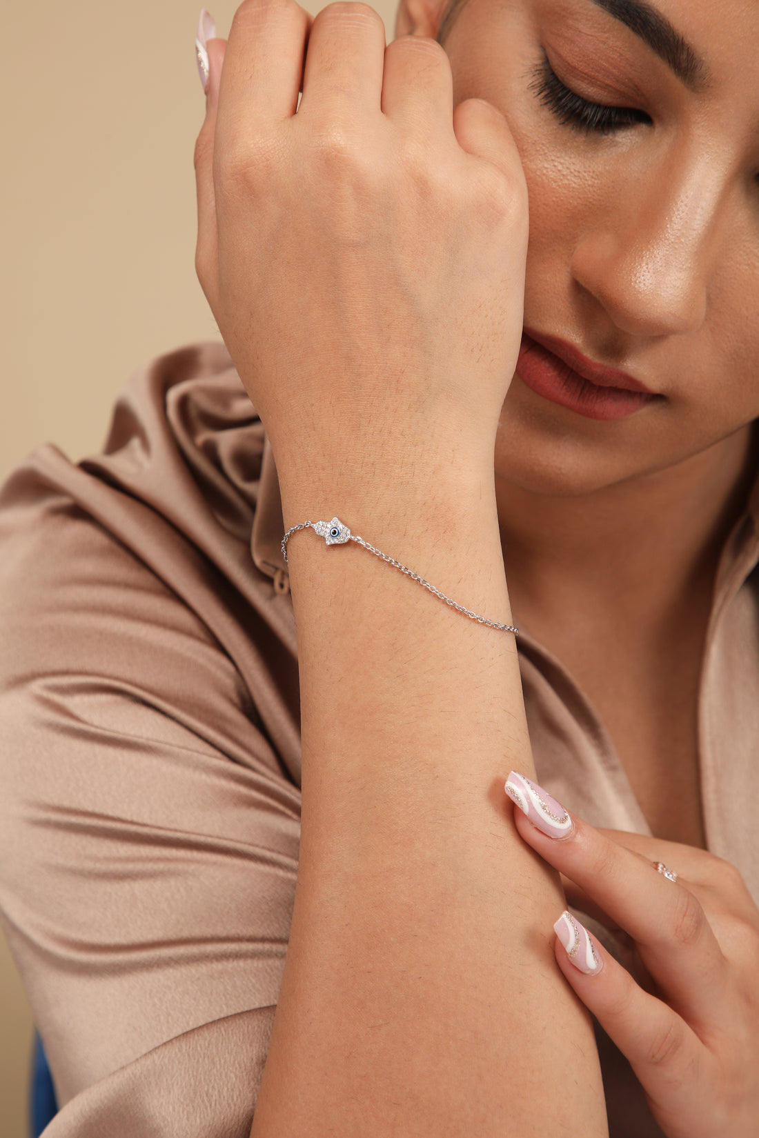 Elevate your style and protection with our hand-shaped evil eye silver bracelet. A chic and...