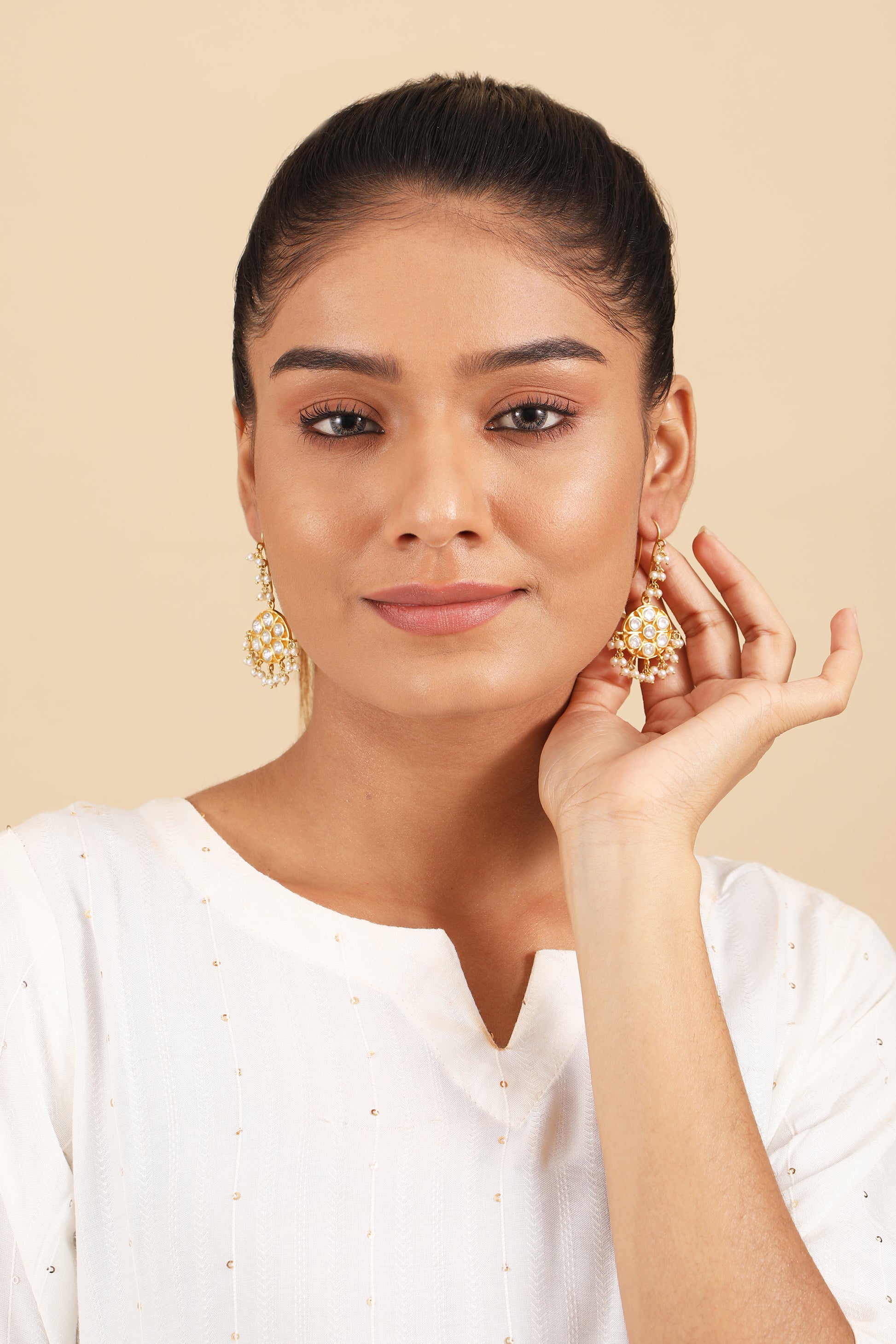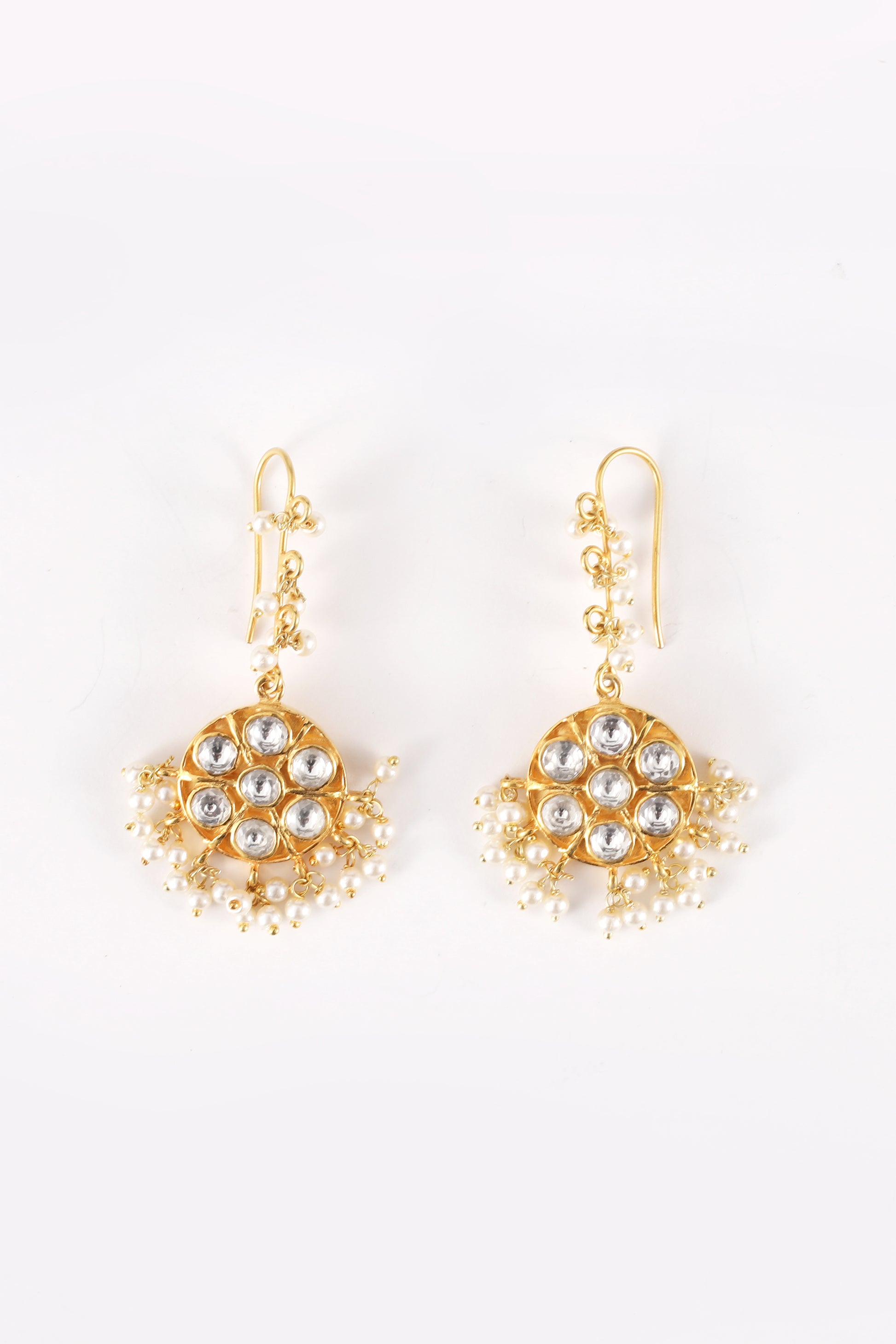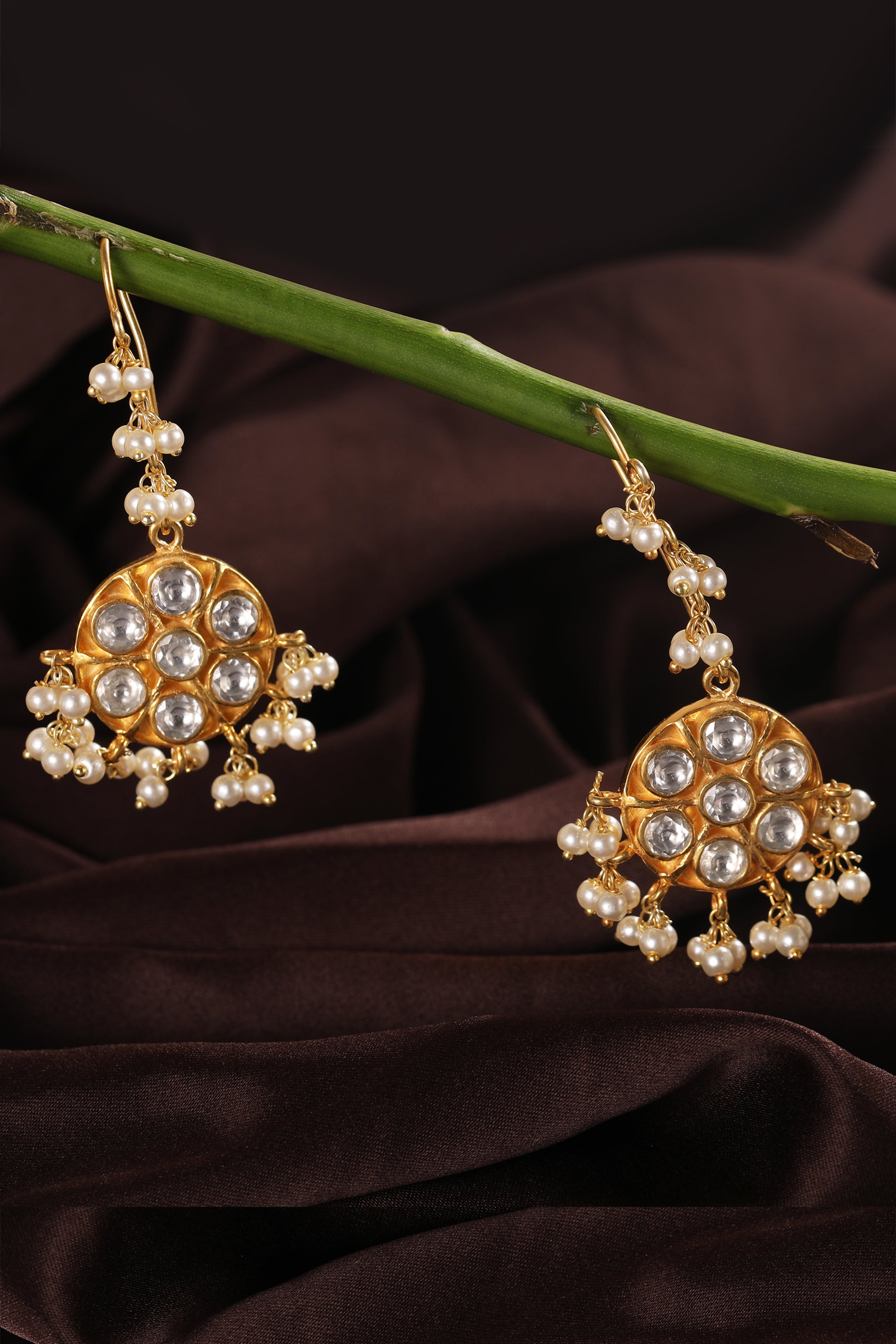 Introducing 'Aakriti' earrings, a harmonious blend of elegance and charm. The round flower drop, embellished with pearls, adds a touch of sophistication to elevate your style effortlessly.