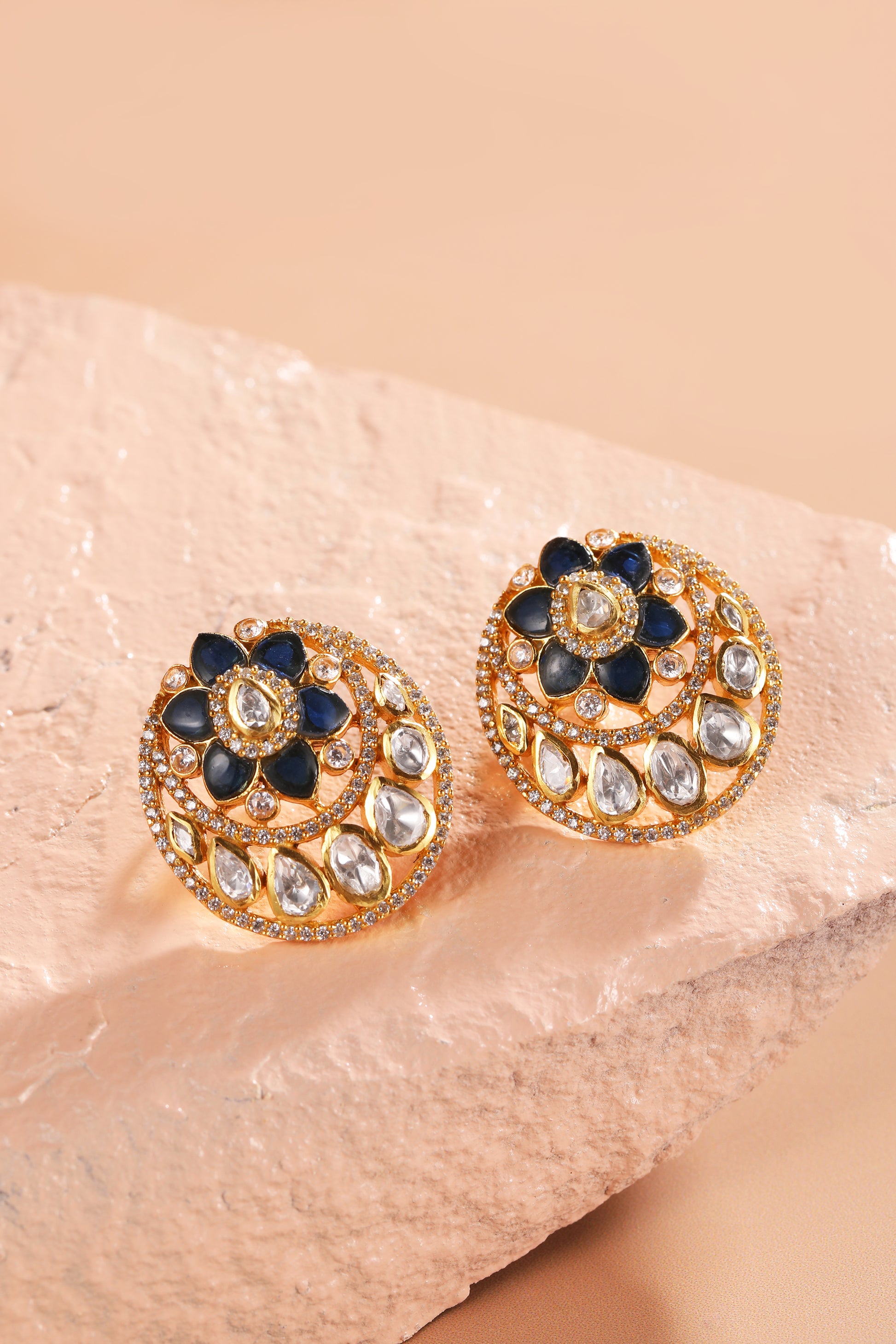 Styling Tip- Pair these blue flower stud earrings with a richly embroidered saree or lehenga in complementary shades such as royal blue, silver, or ivory. The intricate floral design and polki motif will beautifully accentuate the traditional attire, adding a touch of sophistication and celestial charm. Complete the look with a matching blue bindi, a sleek bun adorned with jasmine flowers, and a delicate silver clutch to enhance the overall ethereal appeal.