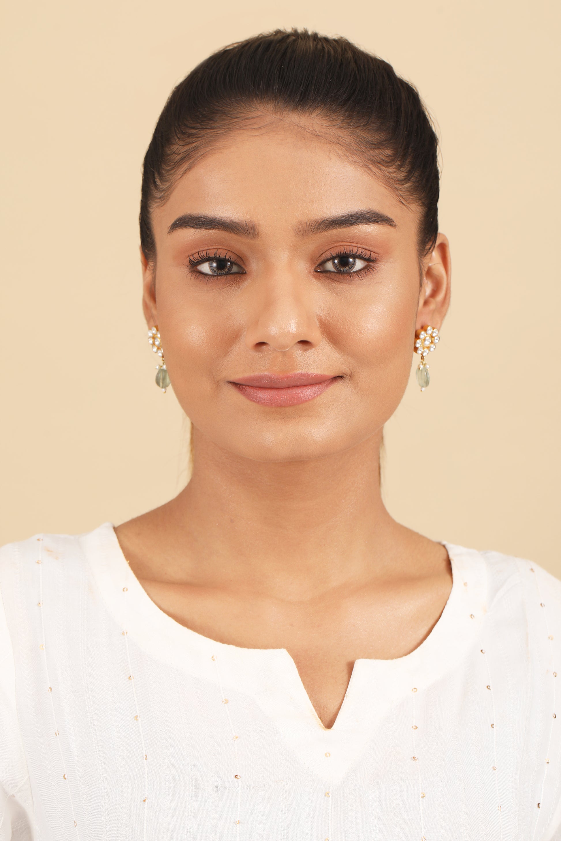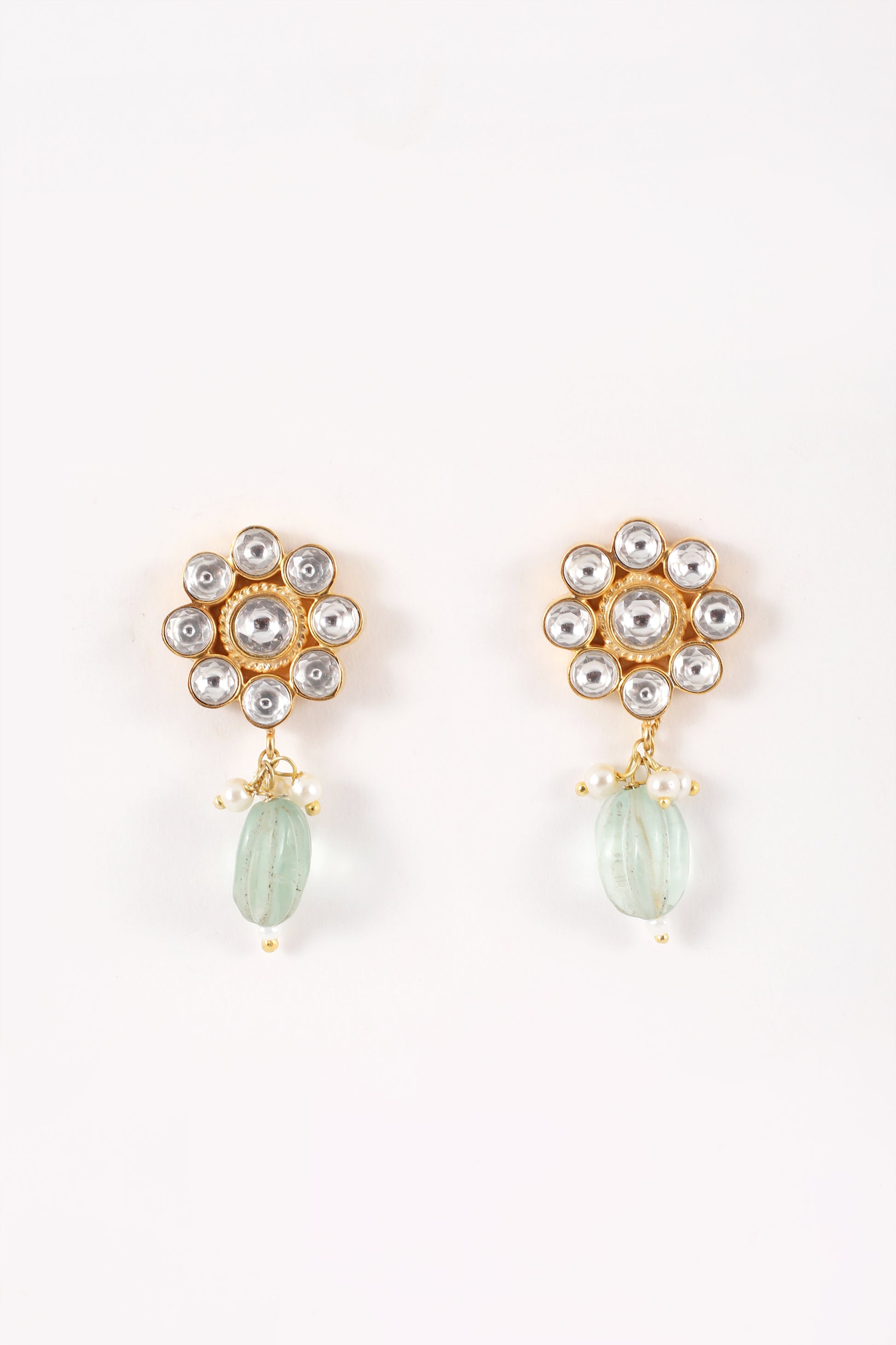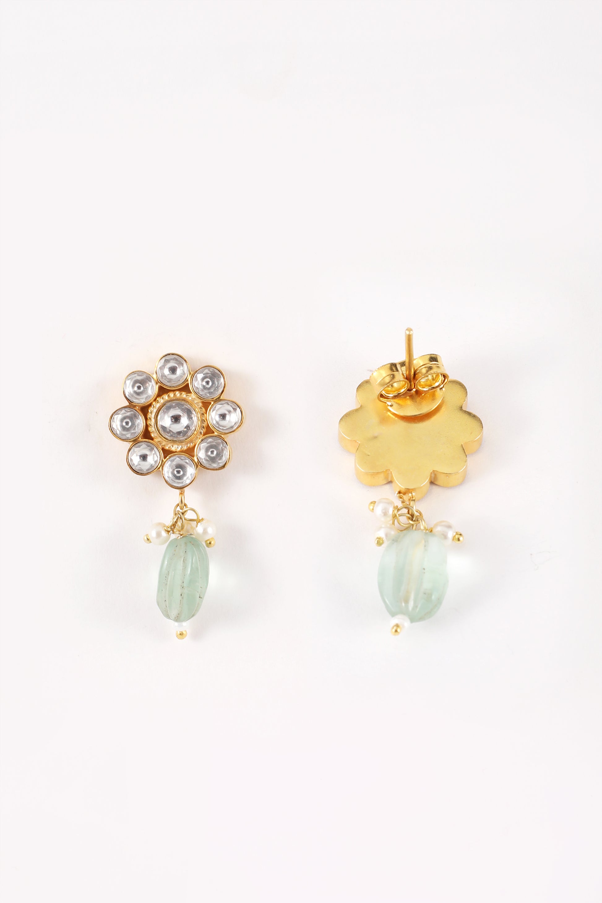 Styling Tip- Adorn the 'Anaya' earrings with a simple ethnic outfit to let the intricate flower pattern shine. The green stone drop adds a touch of elegance, making it perfect for any occasion.