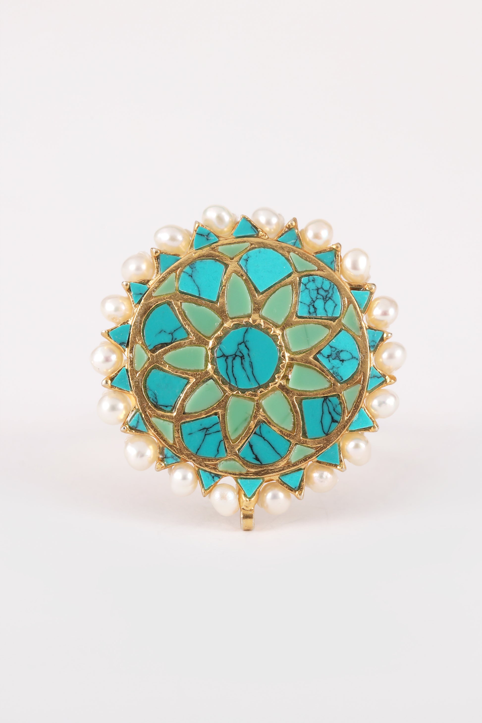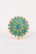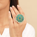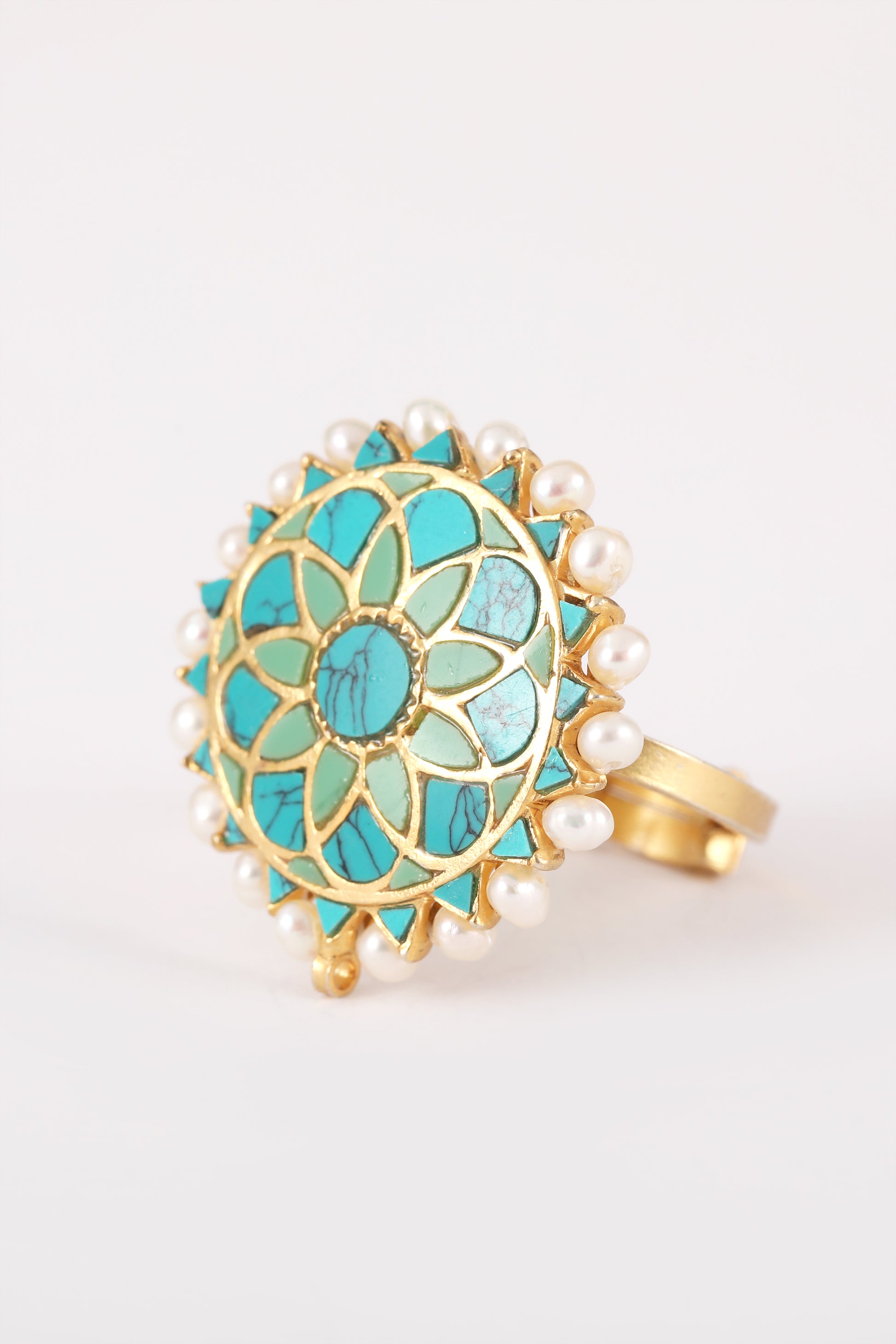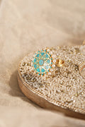 Styling Tip- Elevate your style with the Aria Boho Ring, a chic green mandala pattern in gold polish. Perfect for adding a touch of boho elegance to any outfit, from casual to classy.