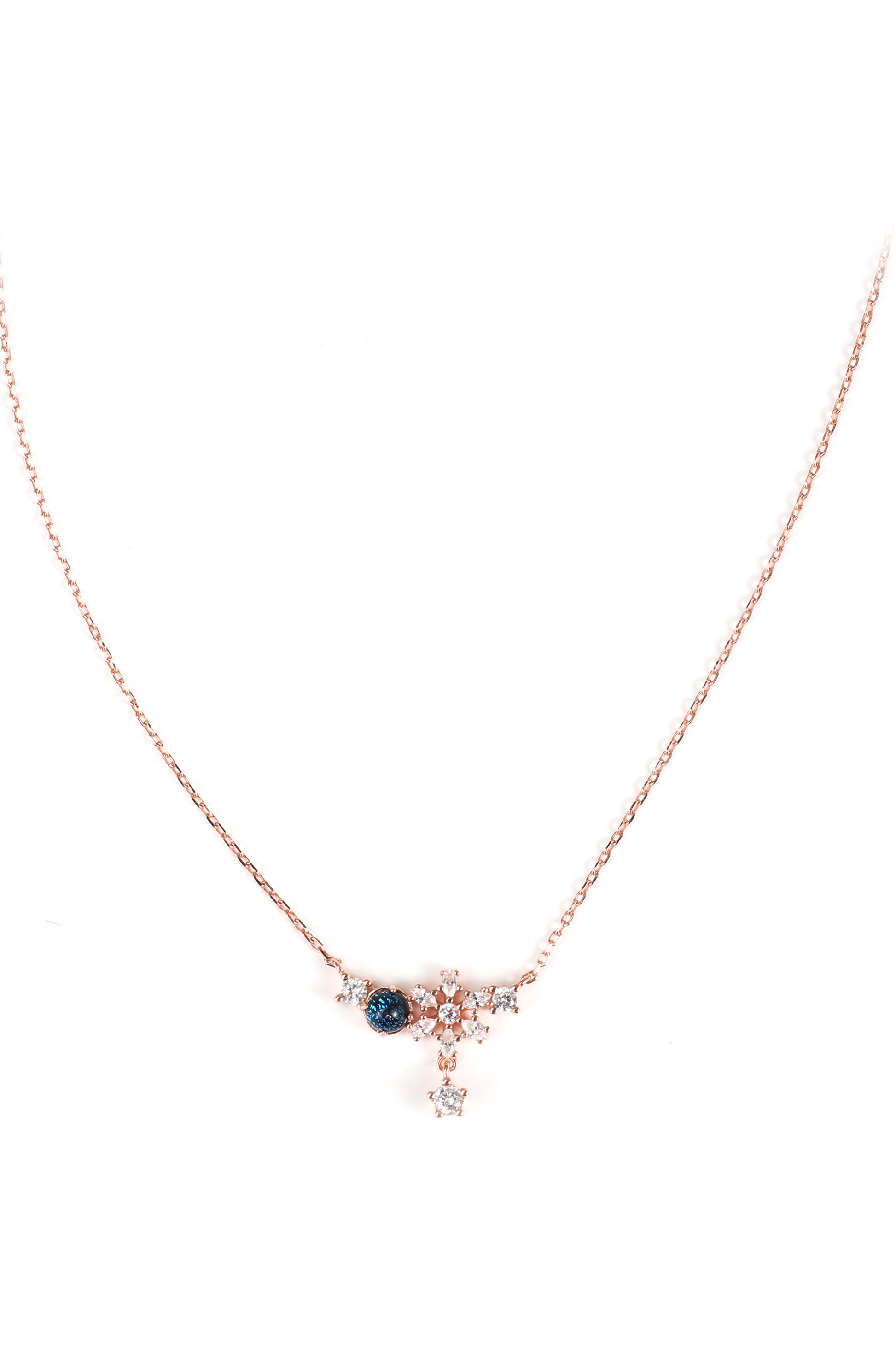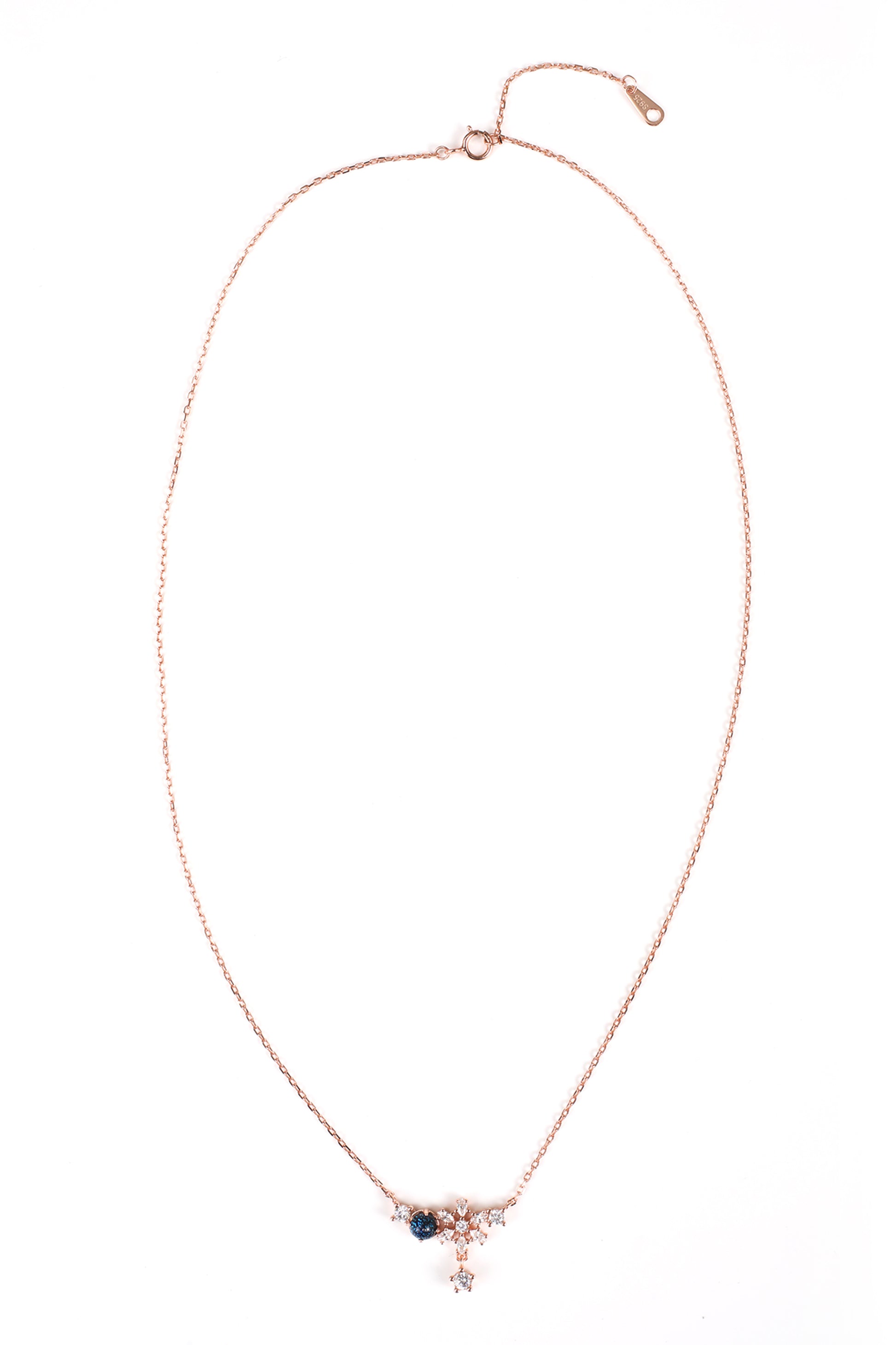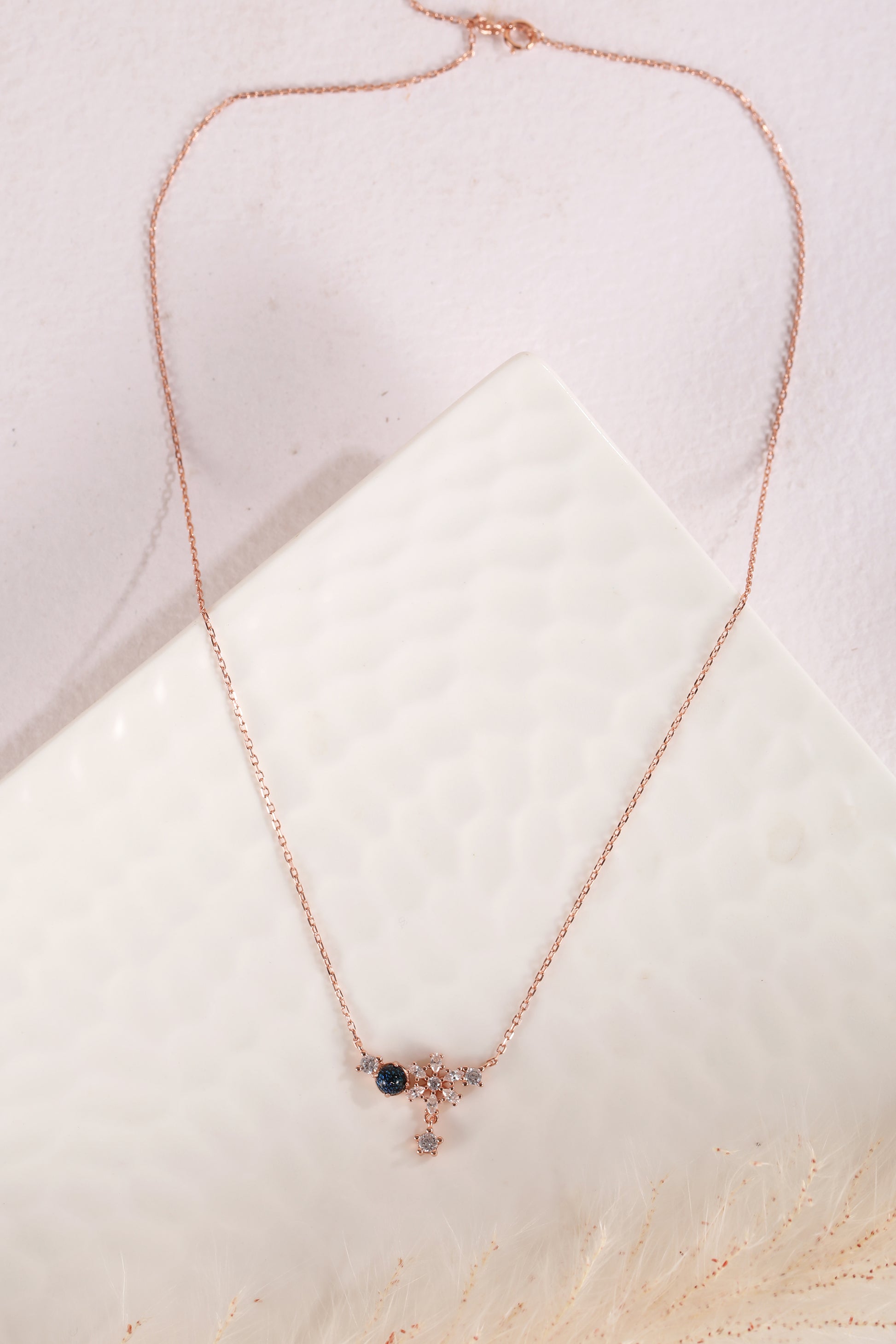 Elegance meets nature in our Azure Floral Pendant. Crafted in silver with a rose gold finish, its intricate floral design surrounds a captivating blue center stone. A timeless silver pendant that adds grace to any ensemble.