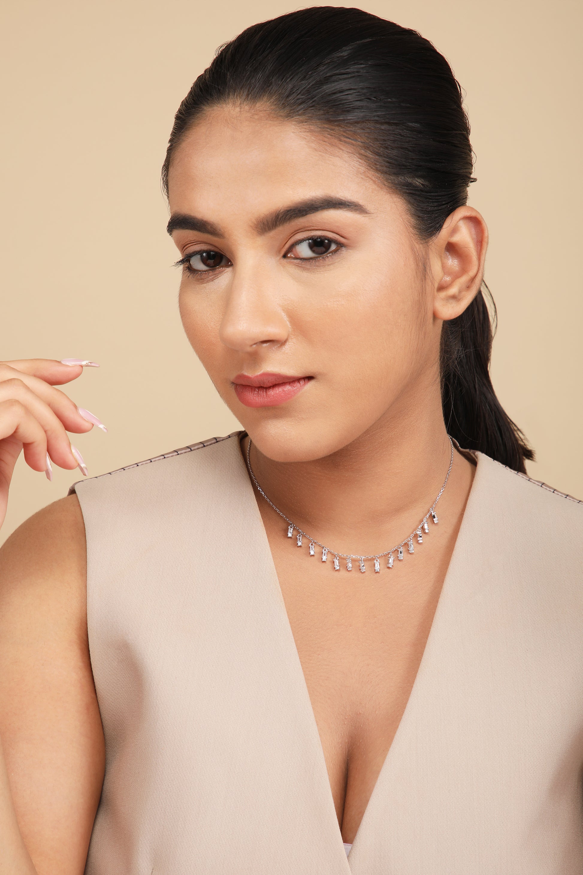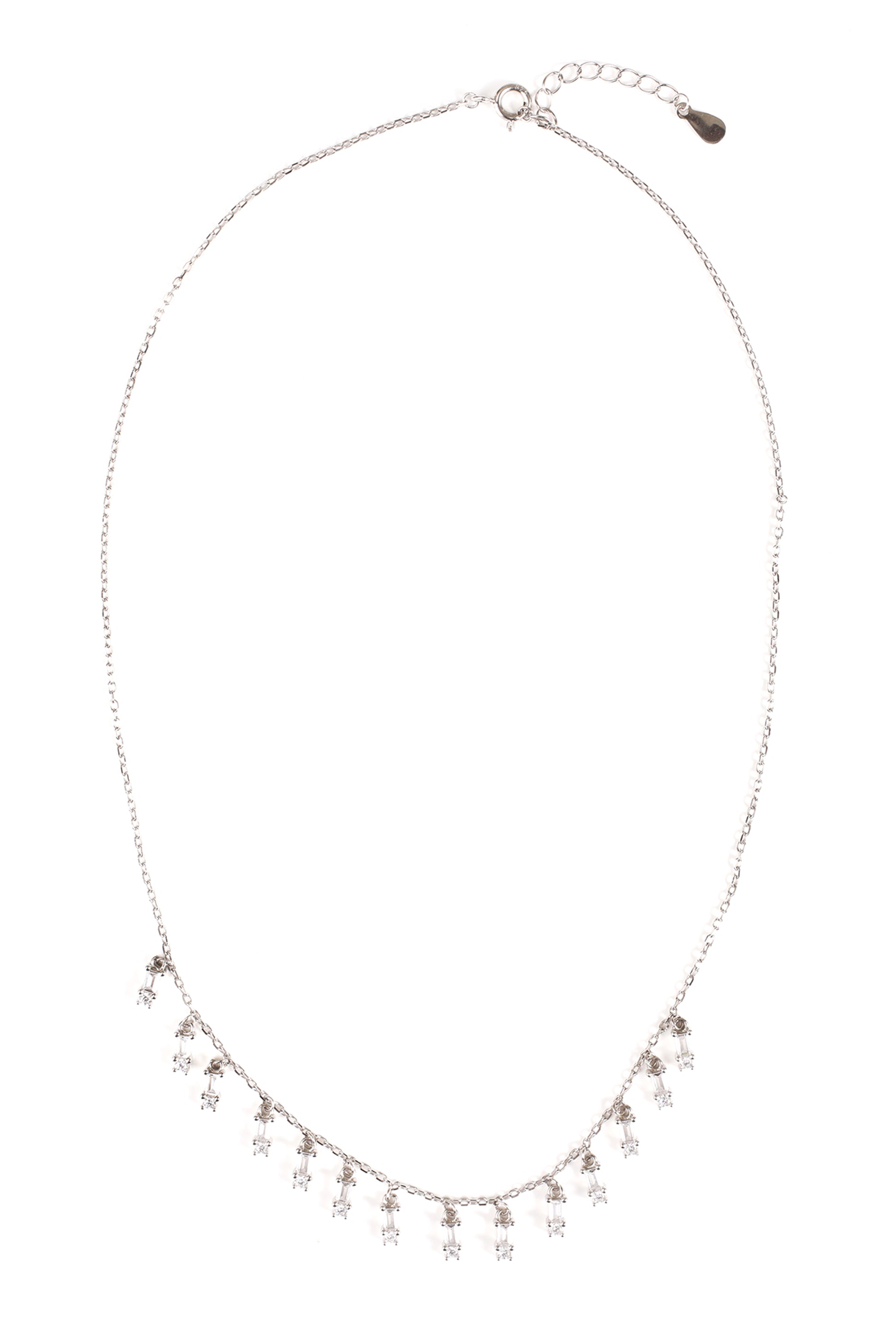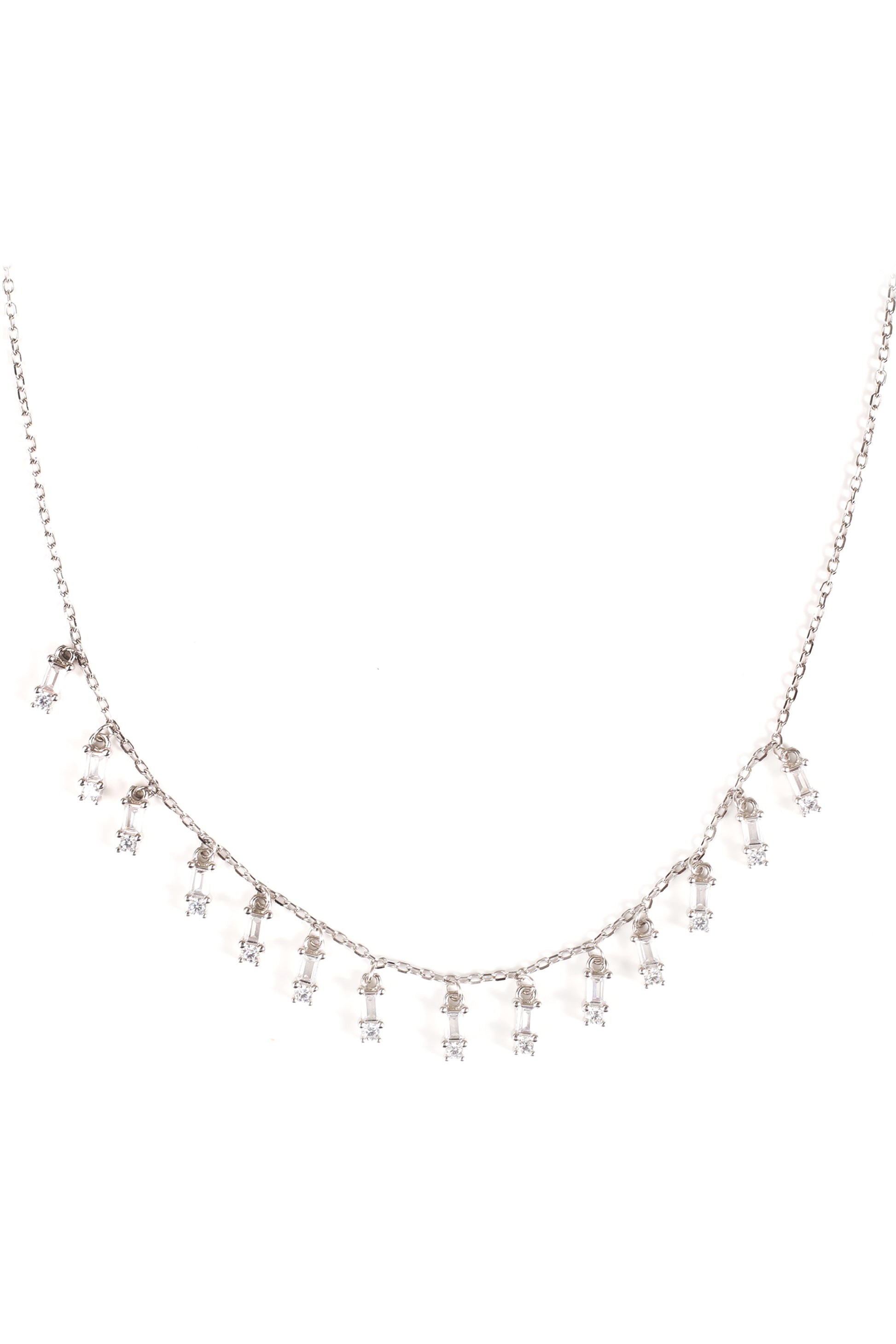 Elegance meets simplicity with our Queen Necklace. Delicate silver chain adorned with petite baguette charms, this necklace exudes timeless charm and subtle sophistication. Perfect for any occasion.
