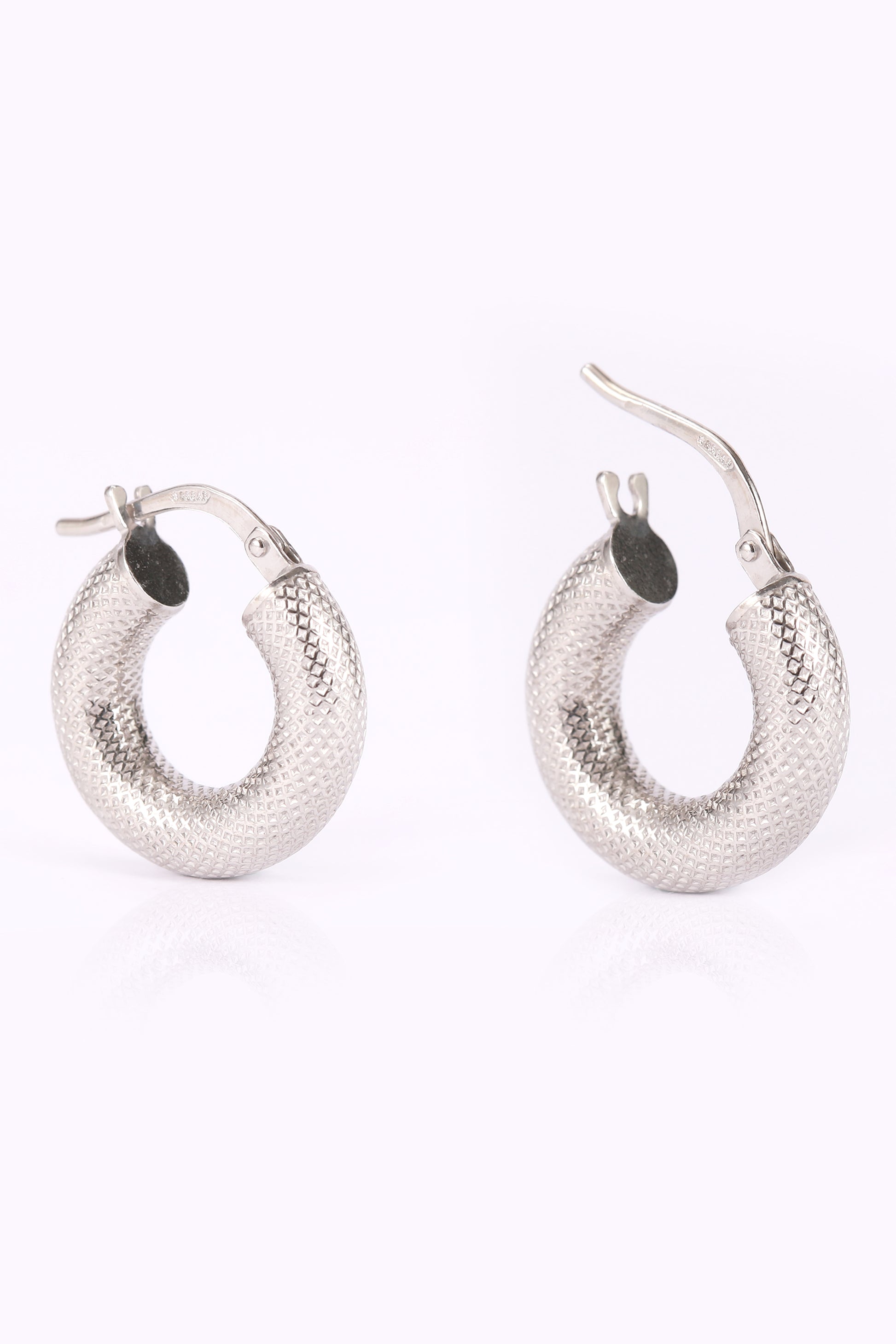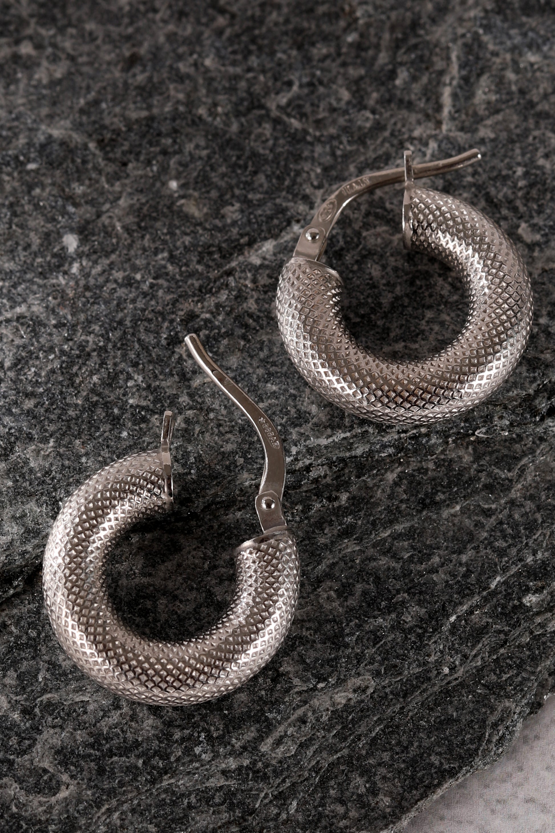 Styling Tip- Elevate your style with bold simplicity. Wear the textured silver hoops with confidence. Their small size adds a subtle statement to any outfit, making them perfect for both casual and formal occasions.