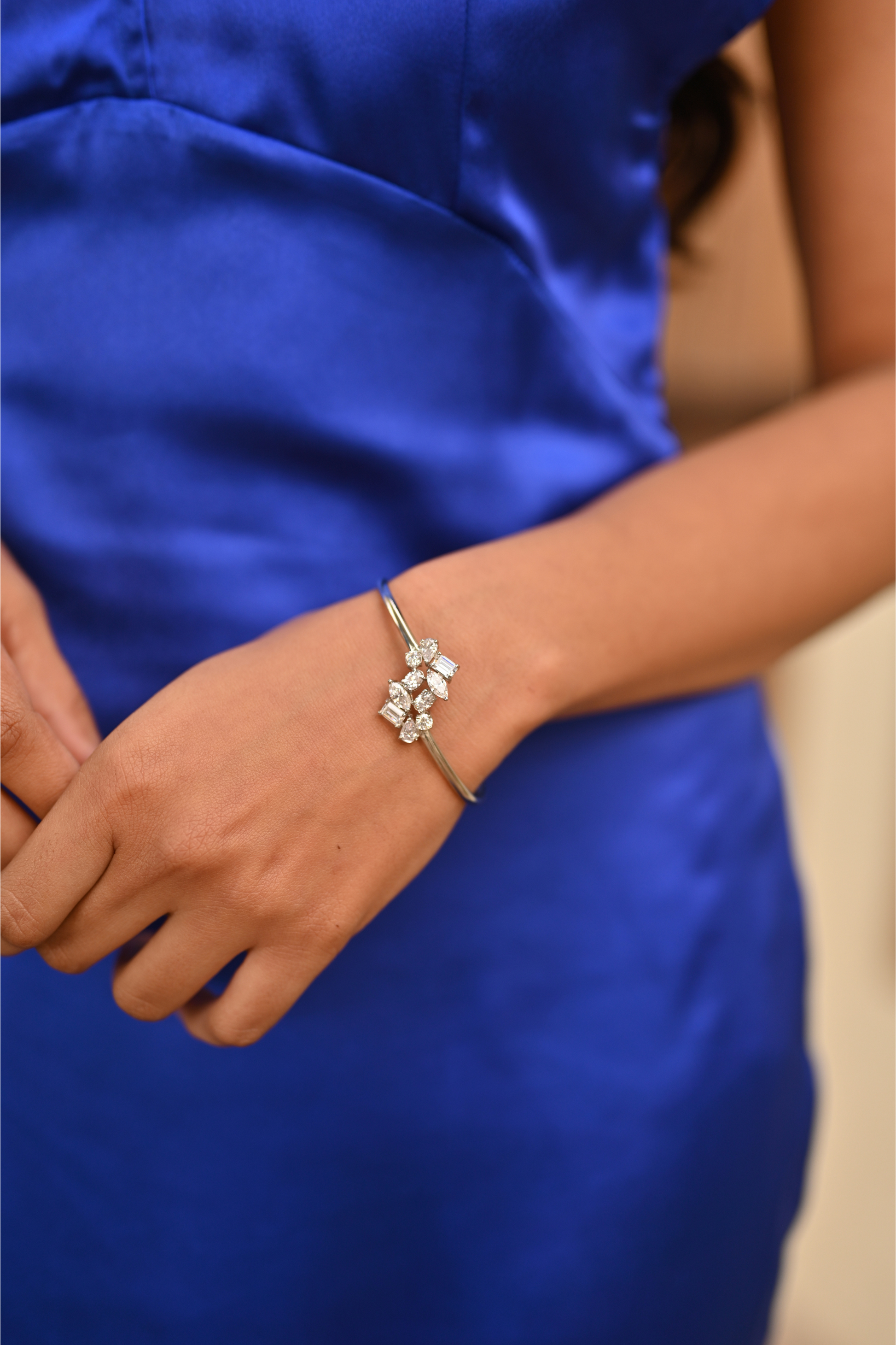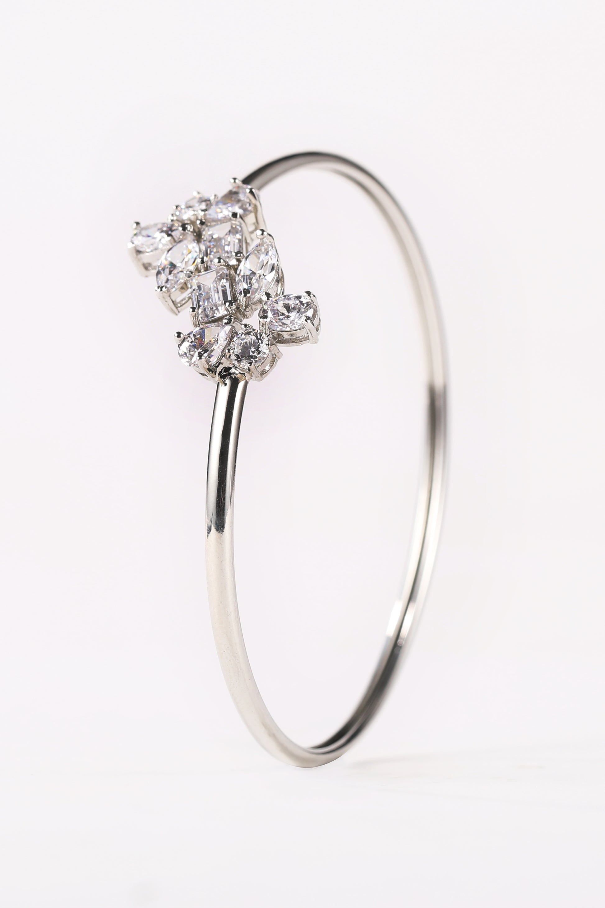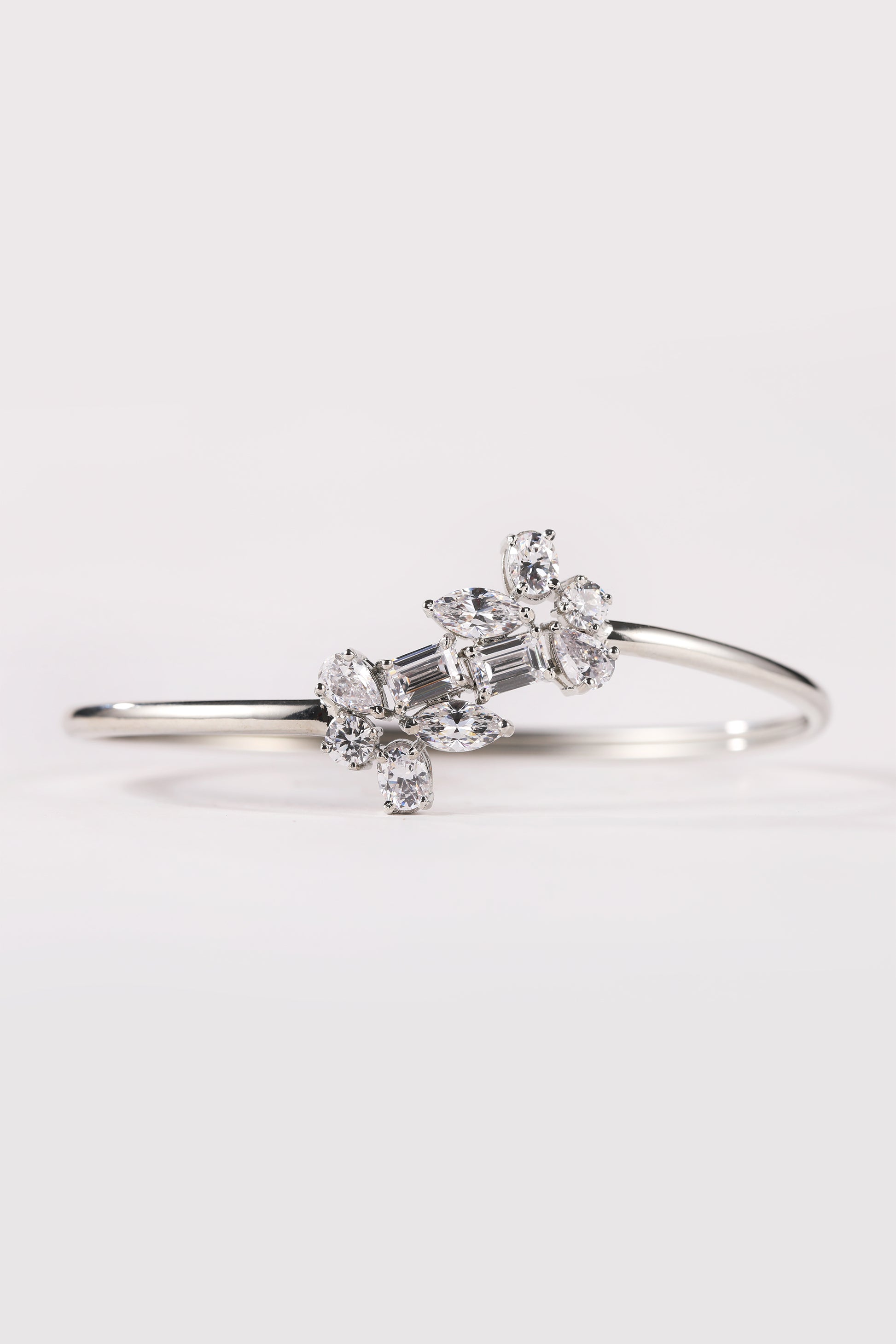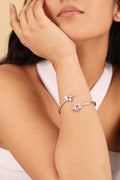 Elevate your personality with our Silver Cluster Open Bracelet, a unique expression of elegance. Crafted in 925 sterling silver and adorned with an array of fancy-shaped crystals, this versatile bracelet enhances your style for every occasion.