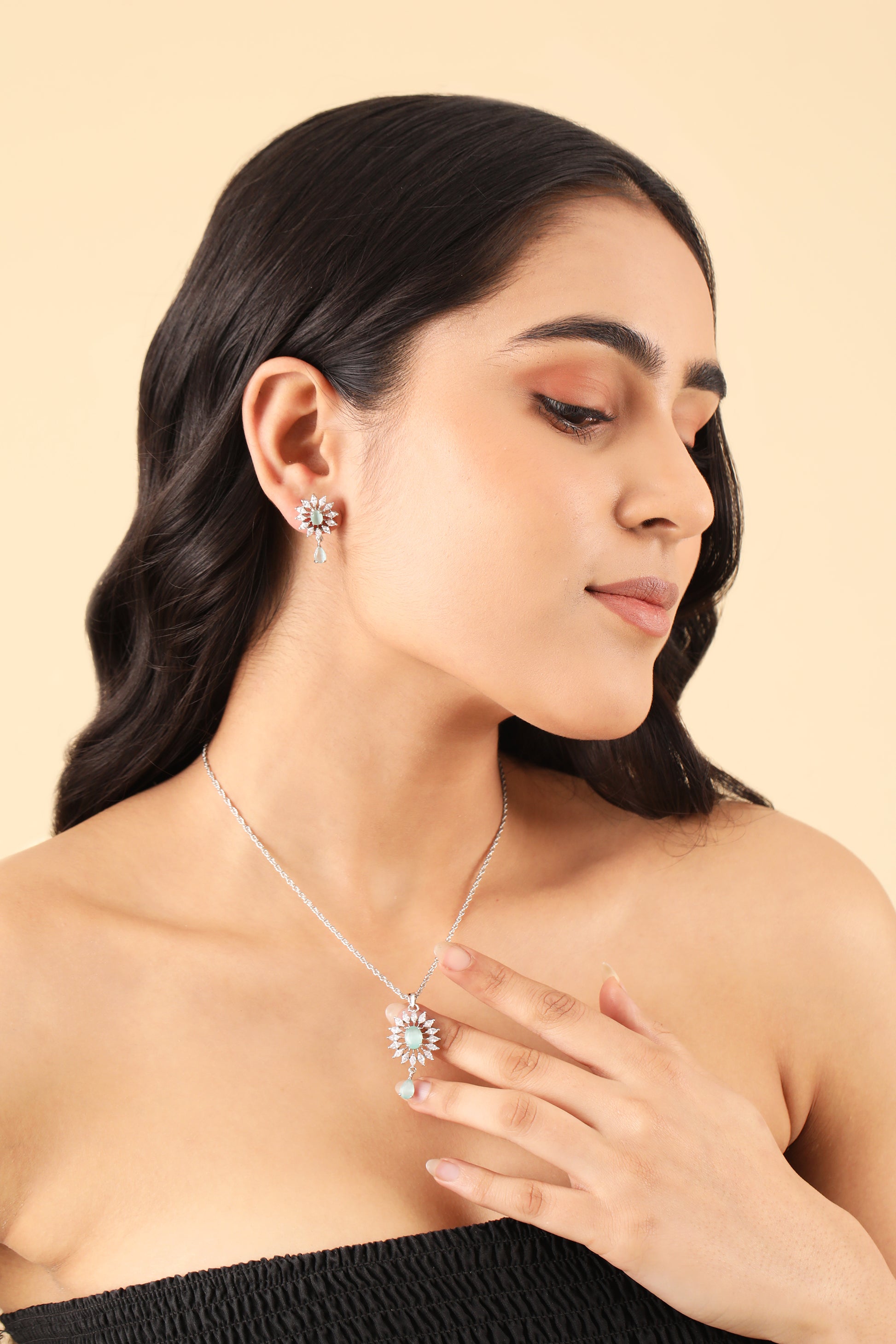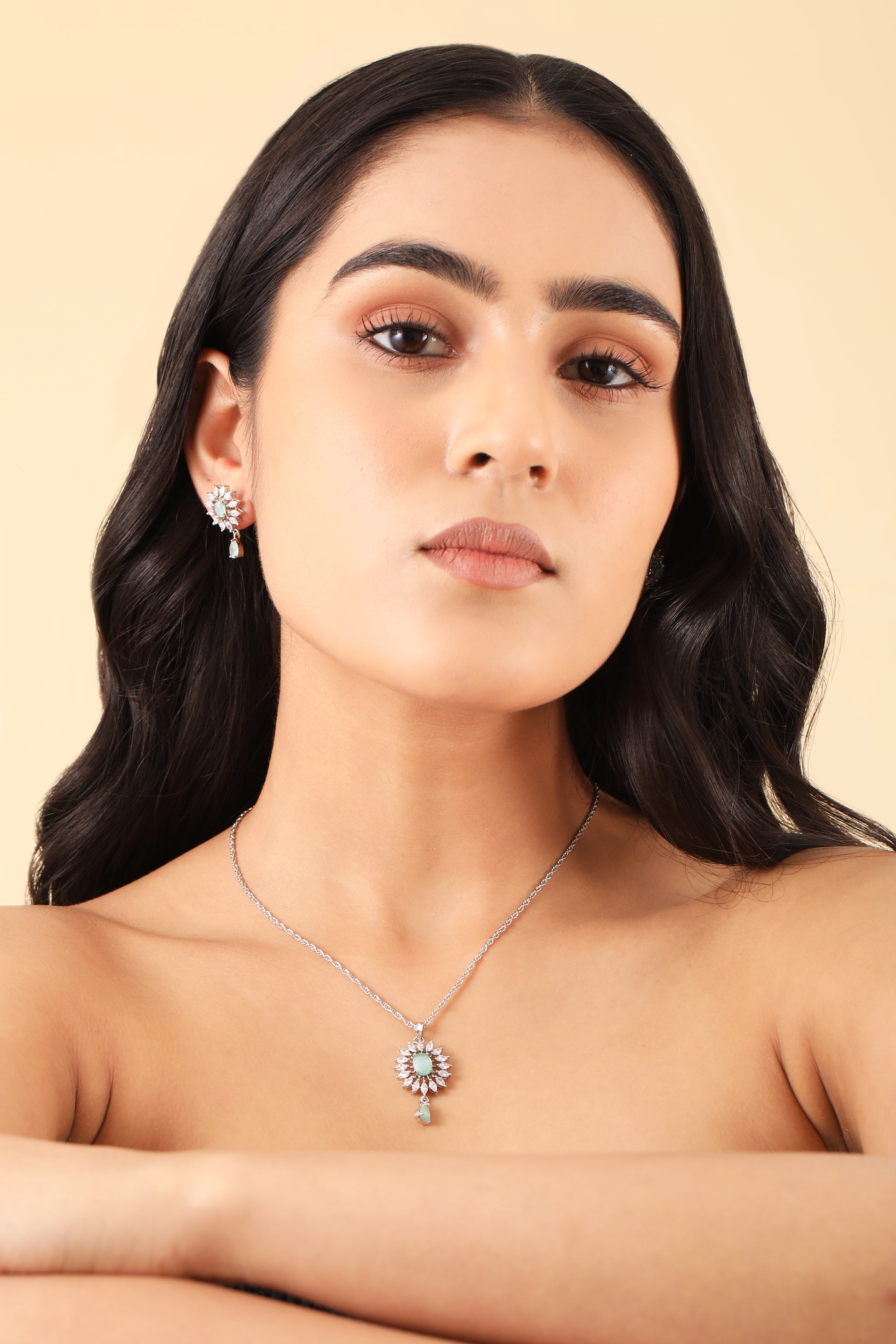 Flowers and Jewellery are a woman’s best friend and what is a better idea to gift than a Mint Green Daisy pendant set? The design is a blend of beauty and simplicity. Made in 925 sterling silver with high-quality marquise shaped crystals and coloured stones, it is perfect to style with any outfit.