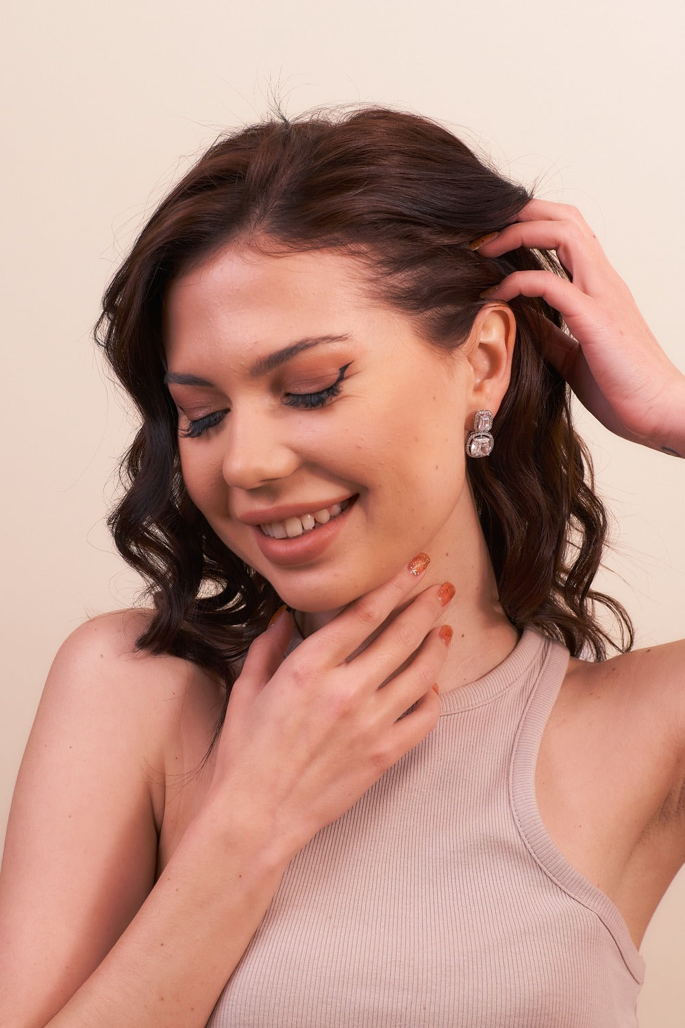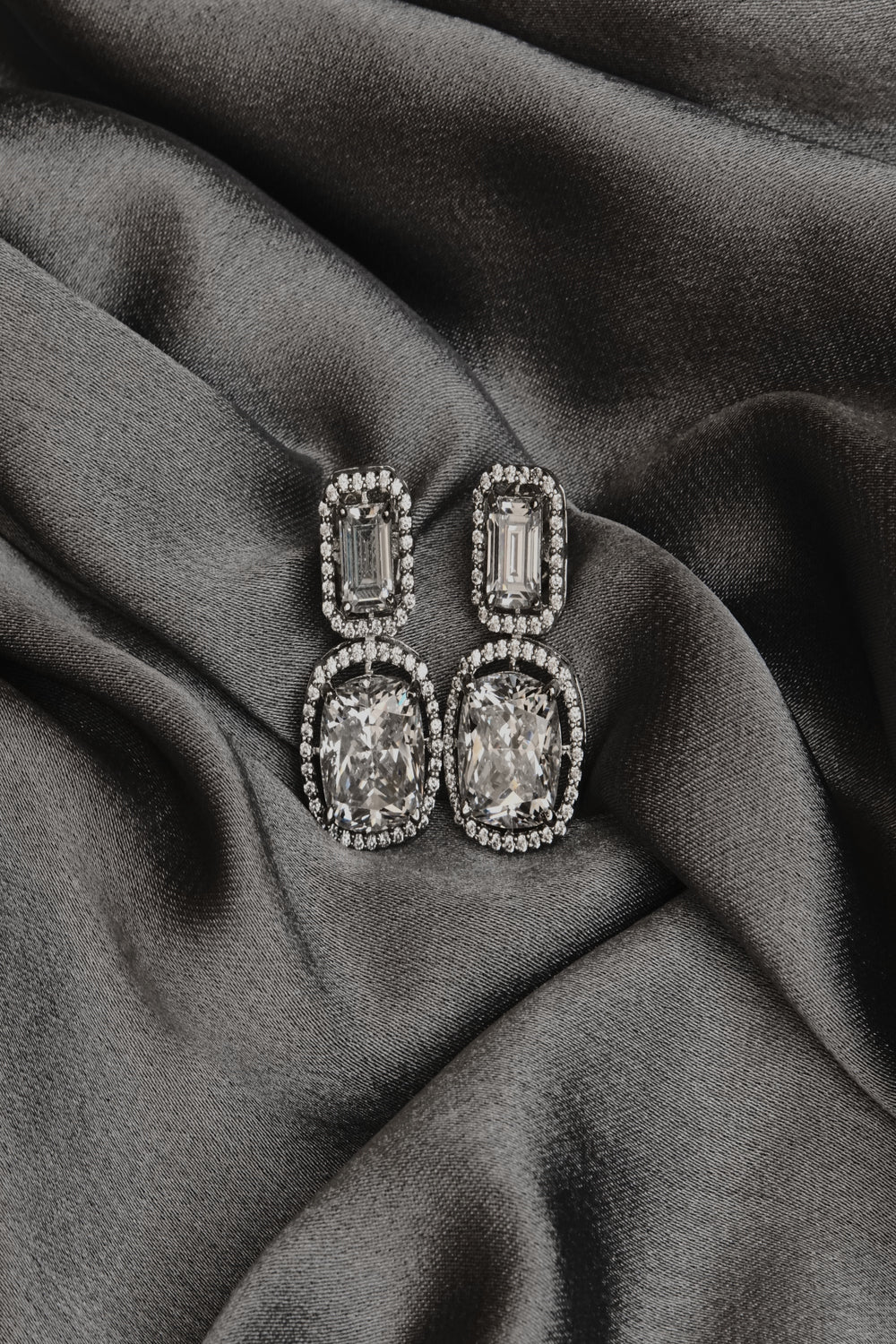Sophistication and Grace in one earring. Perfect for a gala evening, this earring comes with an emerald cut crystal and a large high-quality crystal surrounded by cubic zirconias.