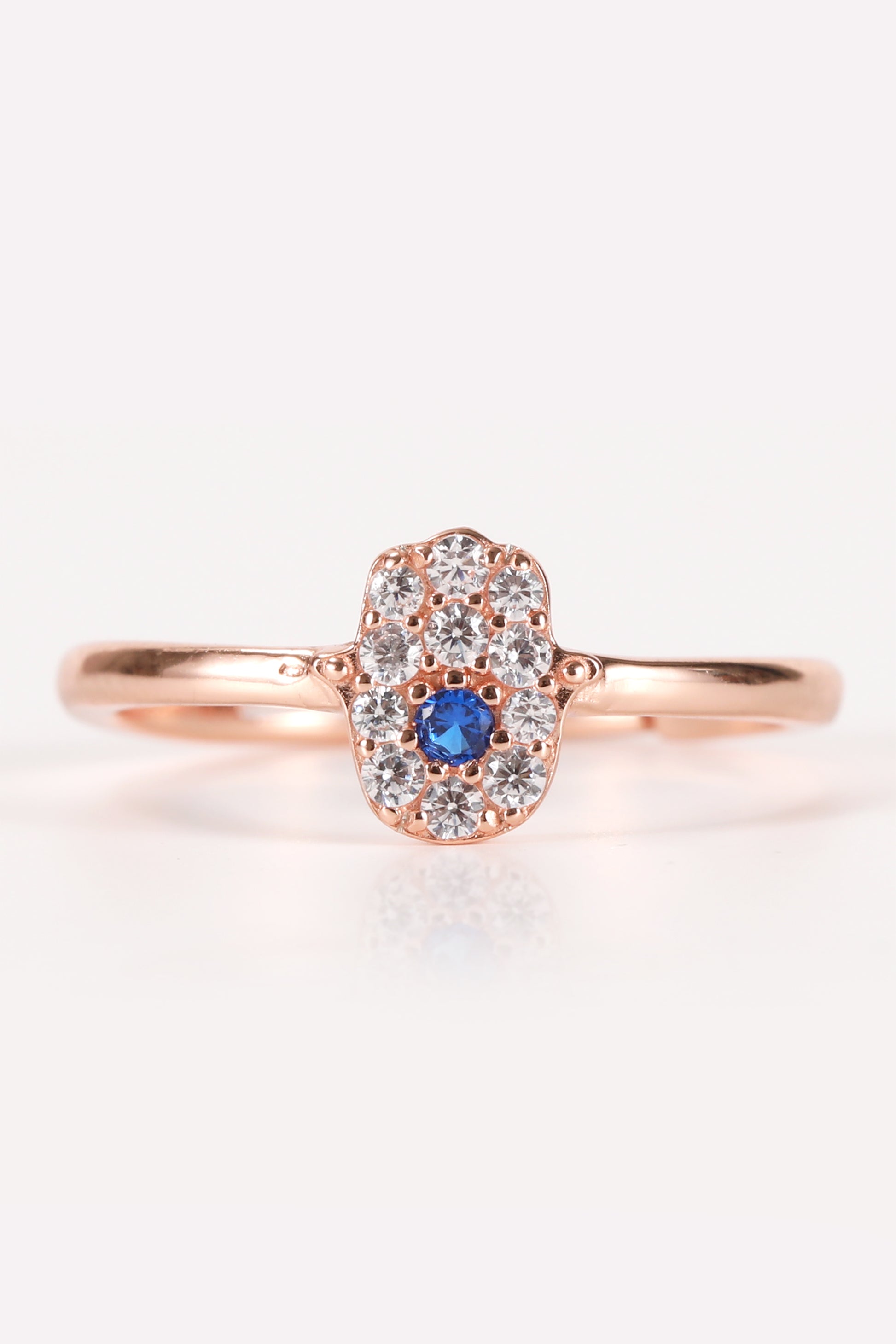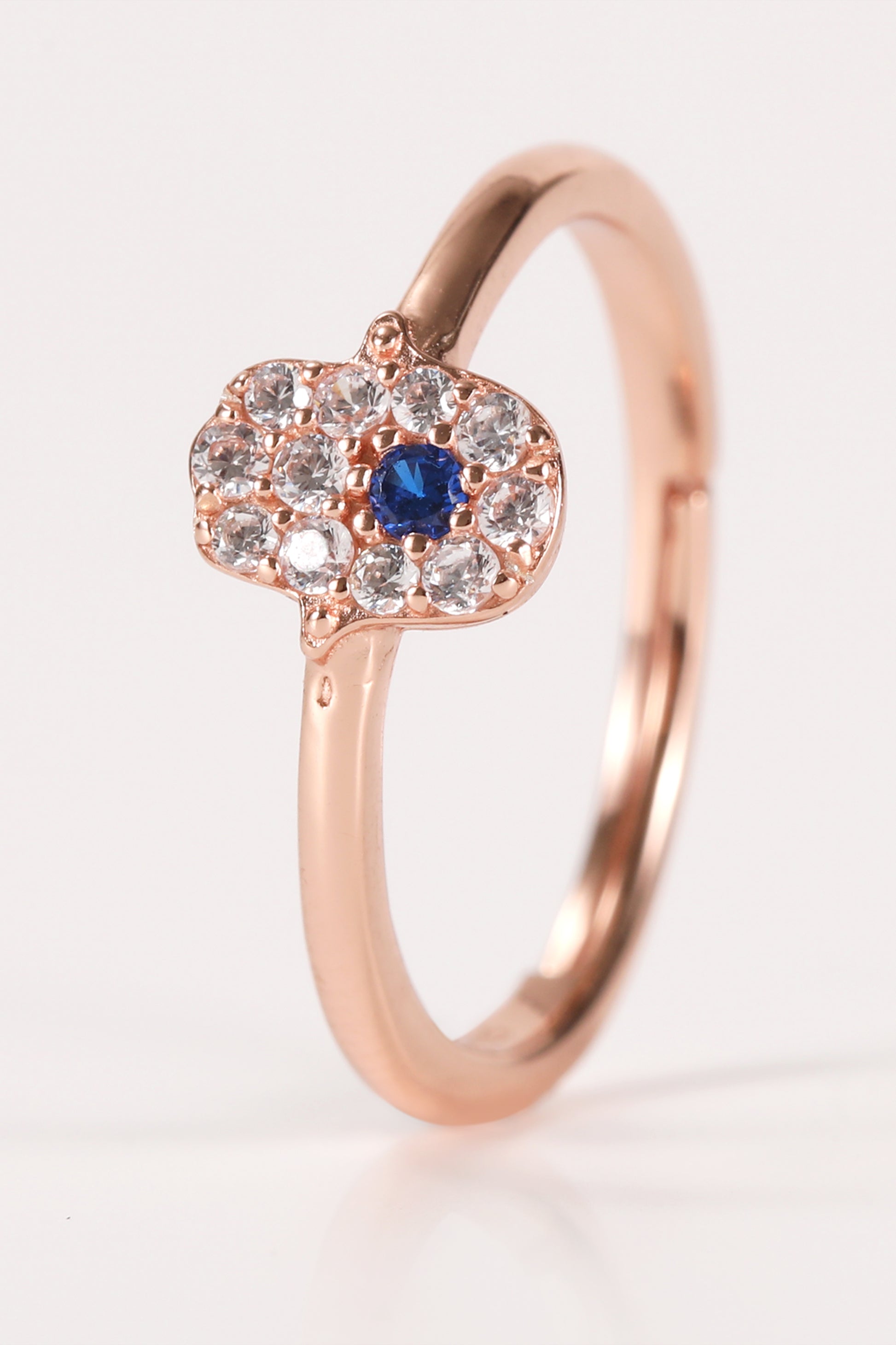 Evoke protection and style with our Evil Eye Silver Ring, delicately handcrafted and adorned with the iconic symbol in a charming rose gold polish. A unique blend of elegance and mystique, this ring is your statement of warding off negativity and embracing positivity.