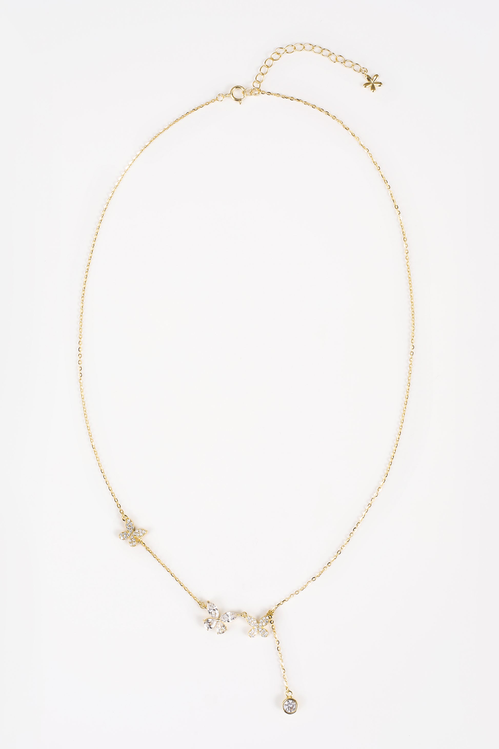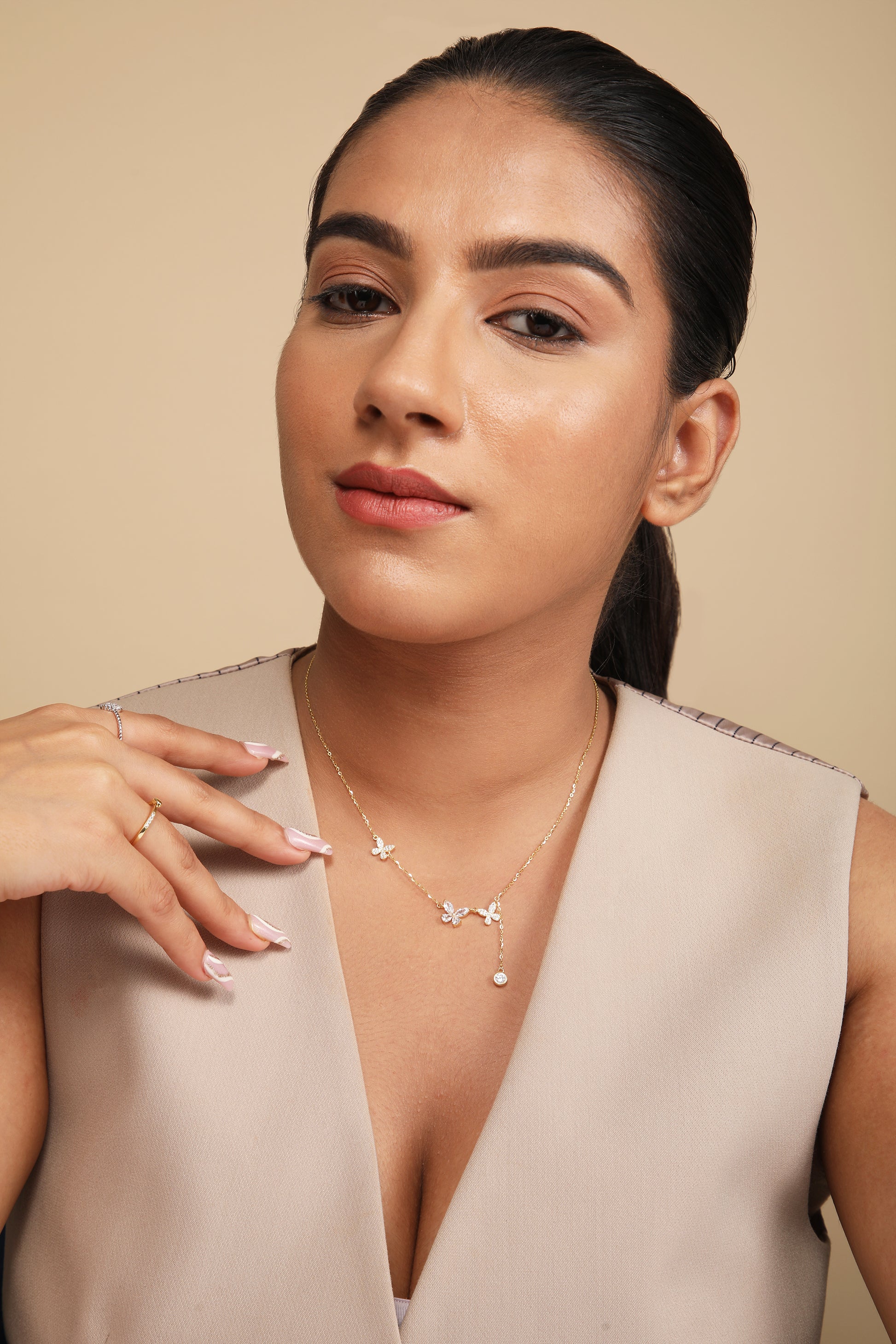 Styling Tip- Elevate your style with the "Flutter with Glow" butterfly pendant. This trend-setting piece, crafted in luxurious 925 sterling silver, features three gold-toned butterfly charms. Pair it with a simple neckline for a statement look that embodies sophistication.
