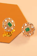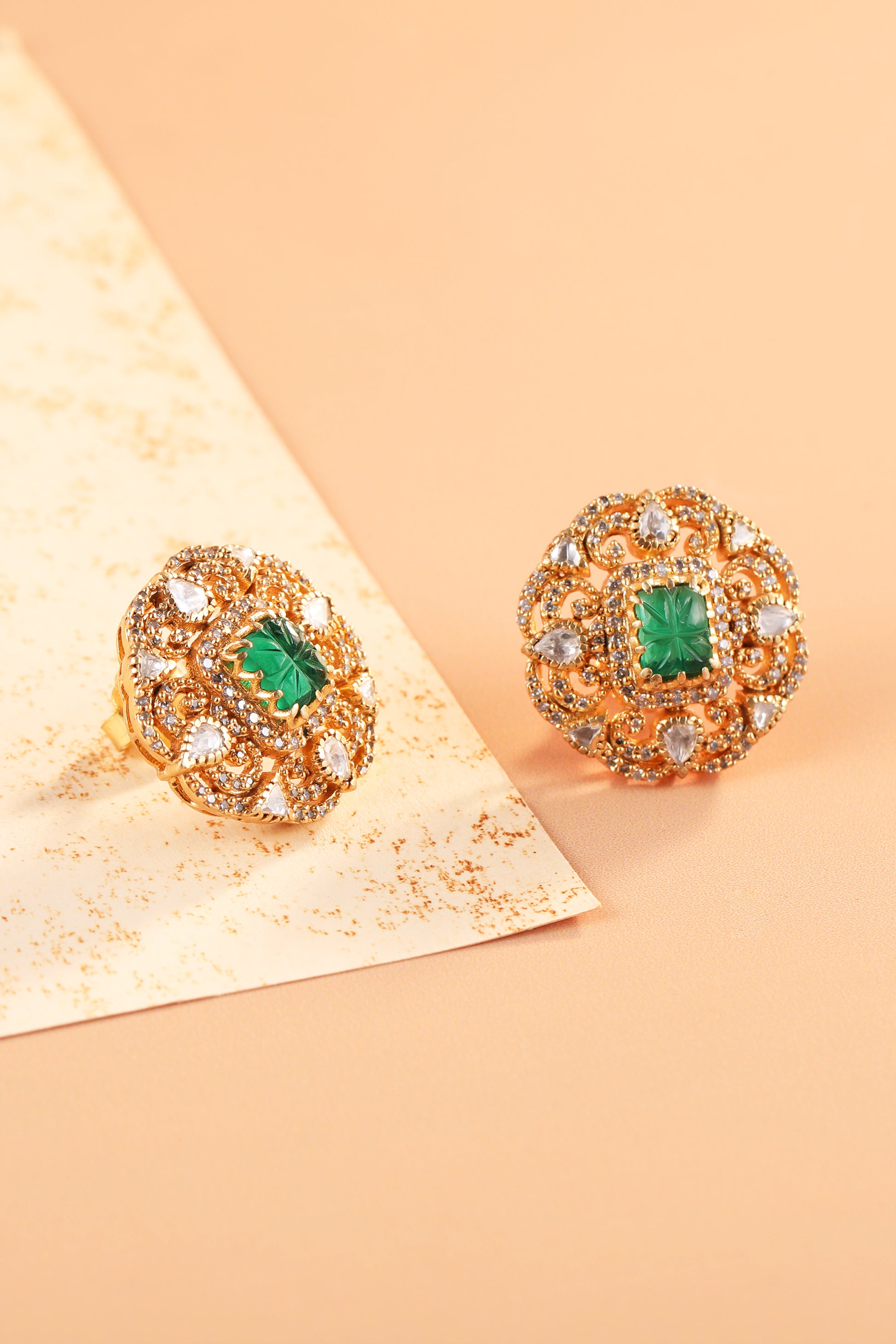 Introducing our exquisite 925 sterling silver stud earrings, featuring a stunning synthetic green stone at the center. Encircled by a delicate pattern of shimmering polki stones and finished in luxurious gold, these earrings add a touch of elegance to any ensemble.