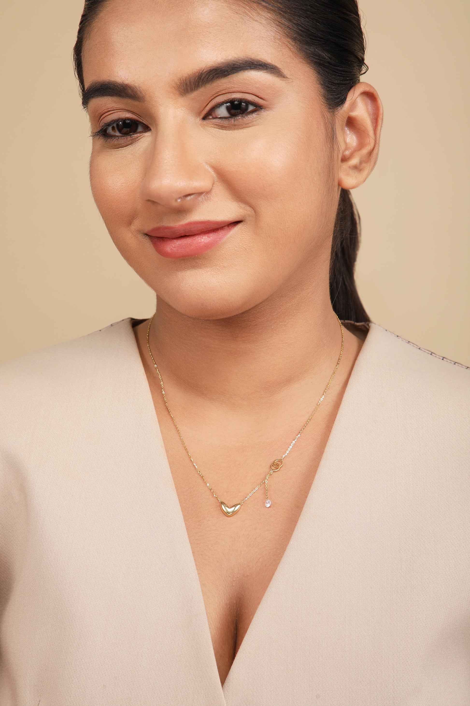 Styling Tip- Adorn your neckline with the timeless elegance of a gold heart pendant in 925 sterling silver. Perfect for everyday wear, pair it effortlessly with any black outfit to add a touch of subtle sophistication.