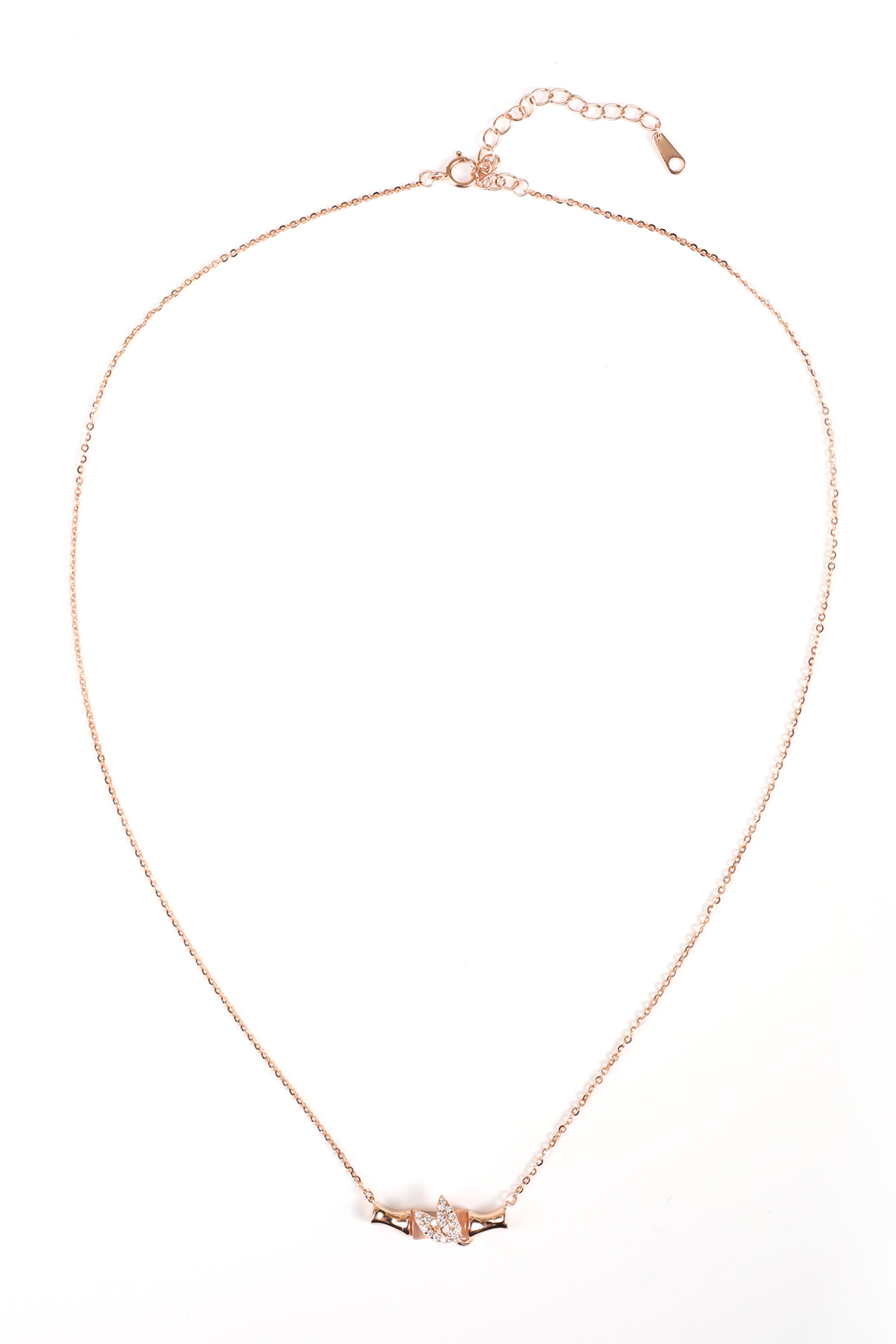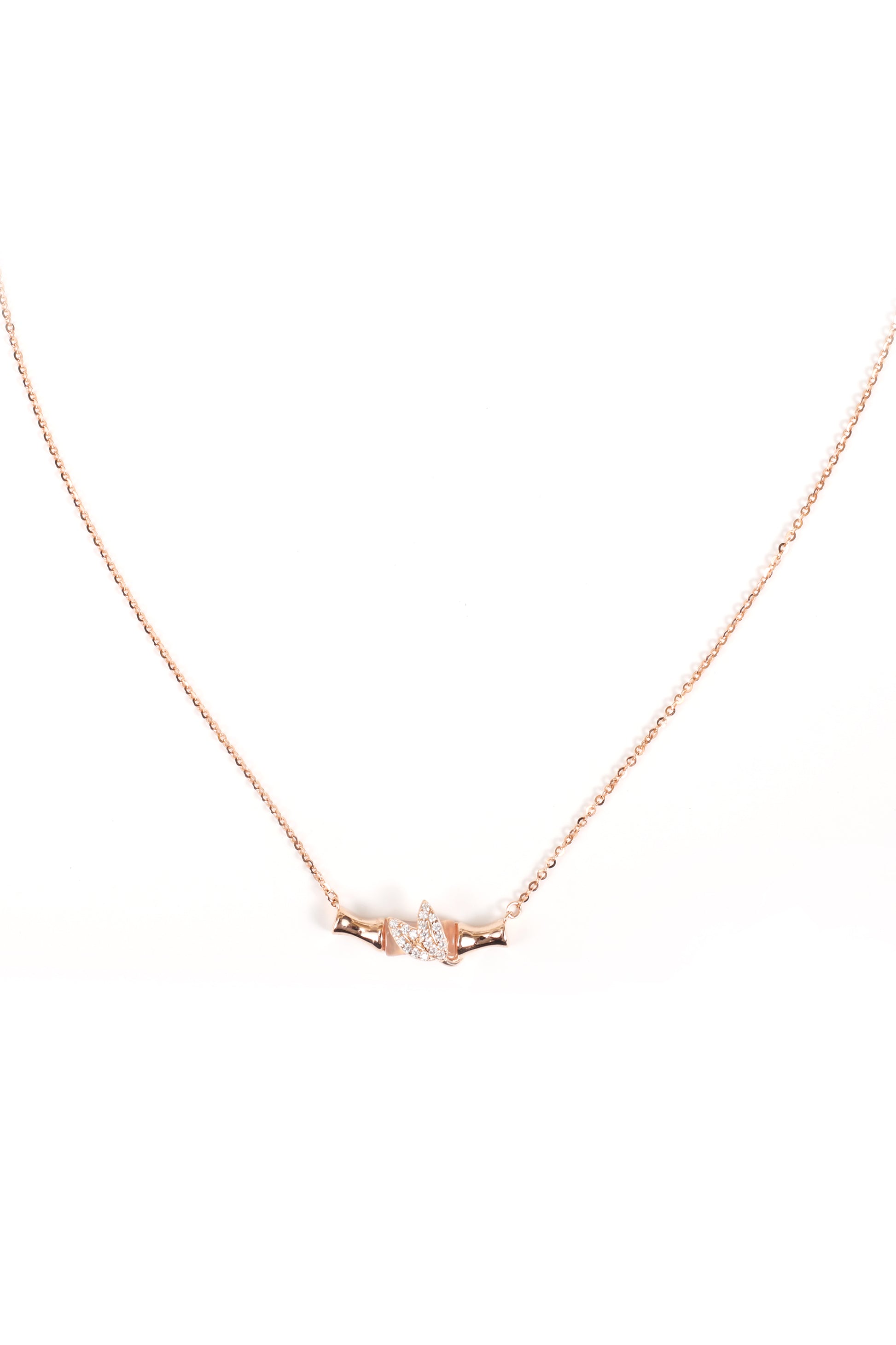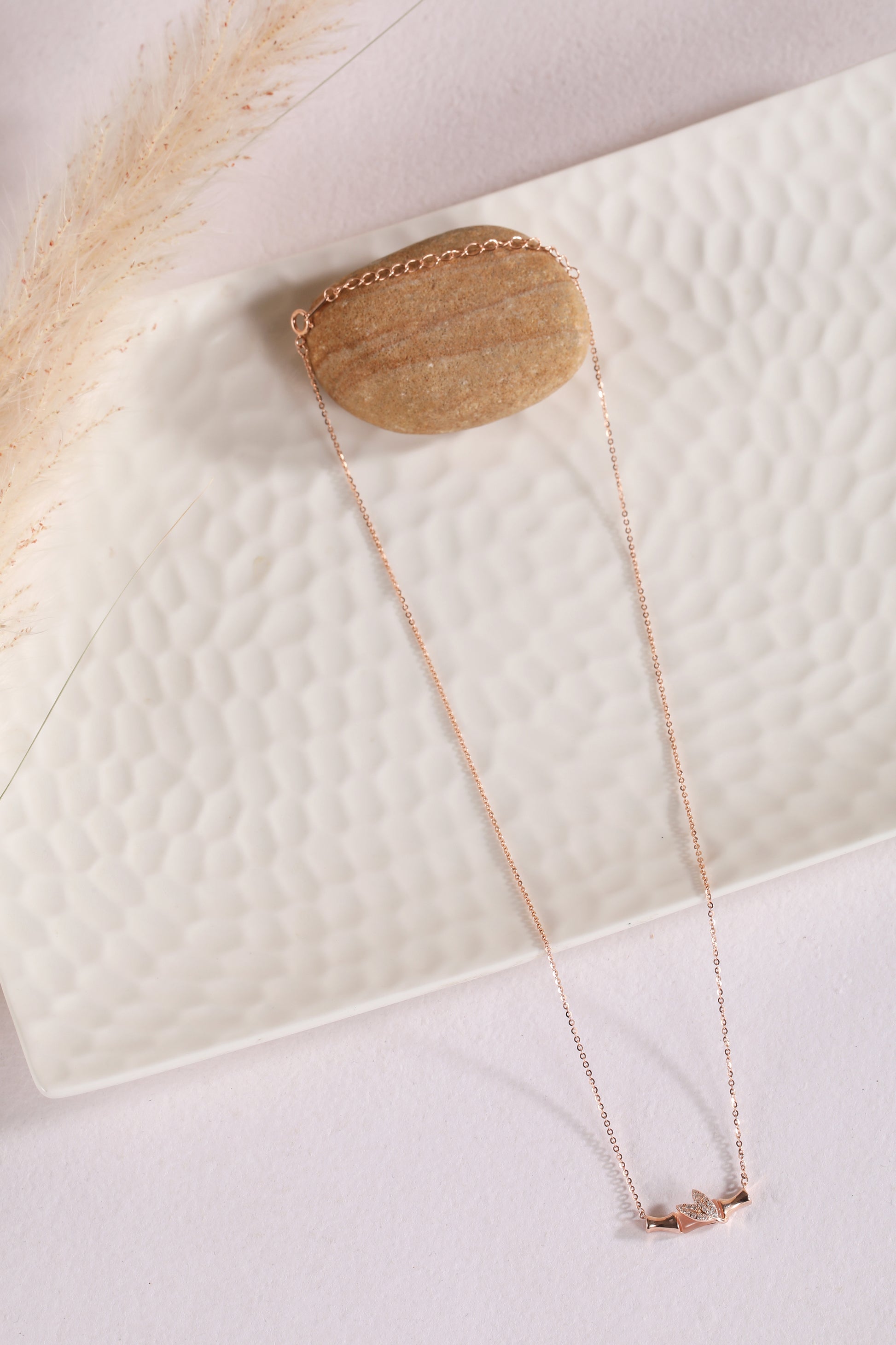 Elegant silver pendant adorned with a stunning stone log and intricate leaf design, accented with a delicate rose gold polish for a touch of luxury and natural beauty.