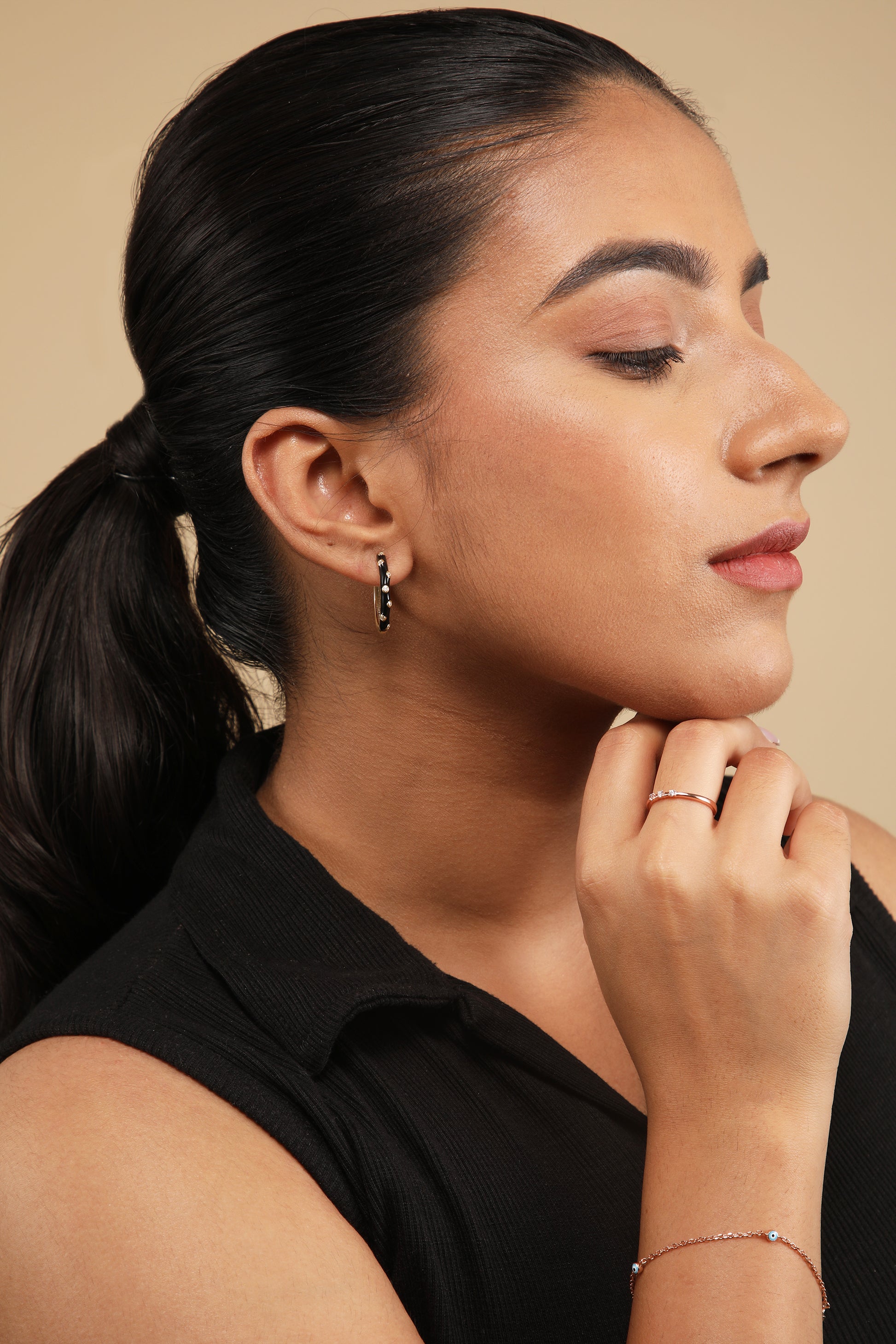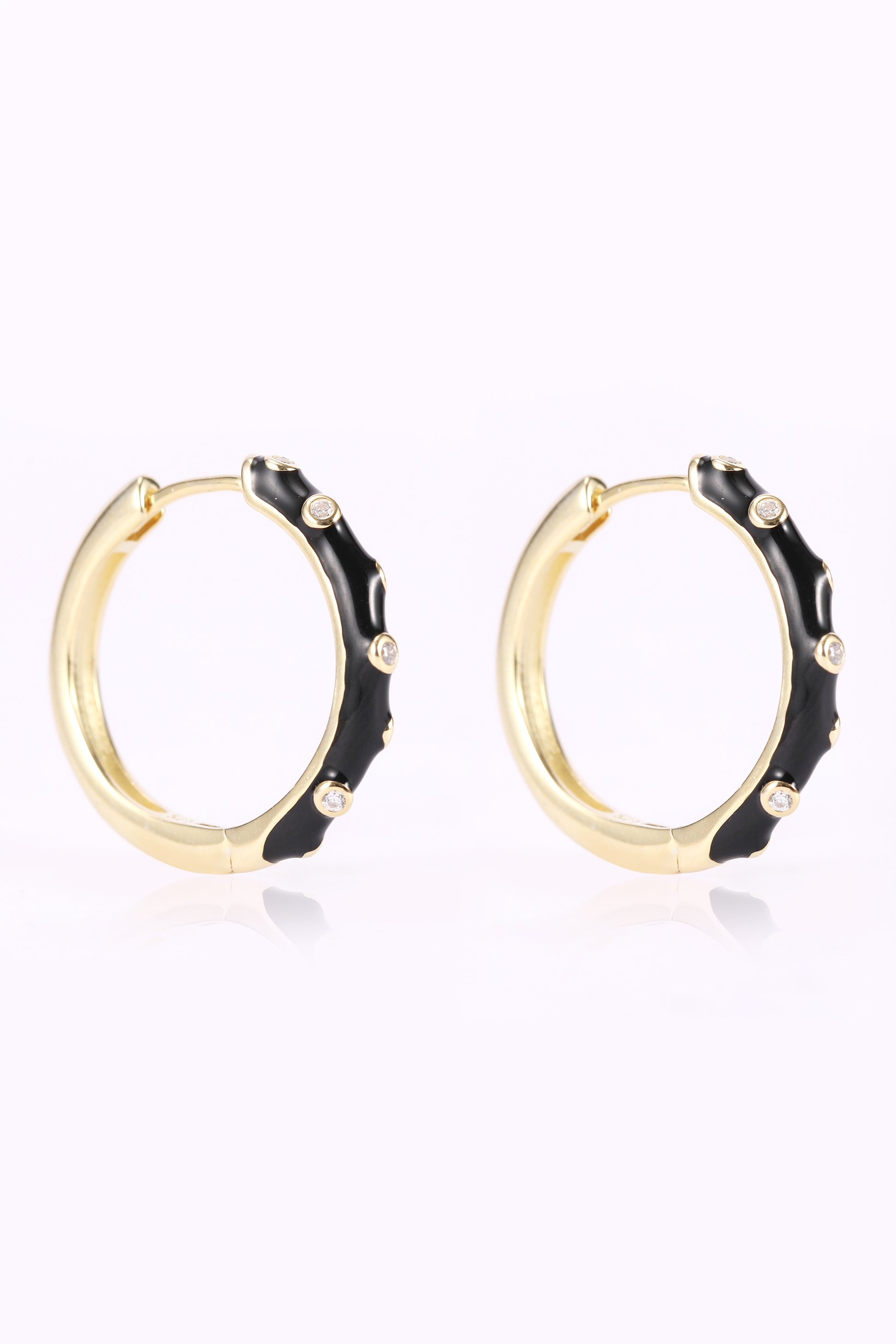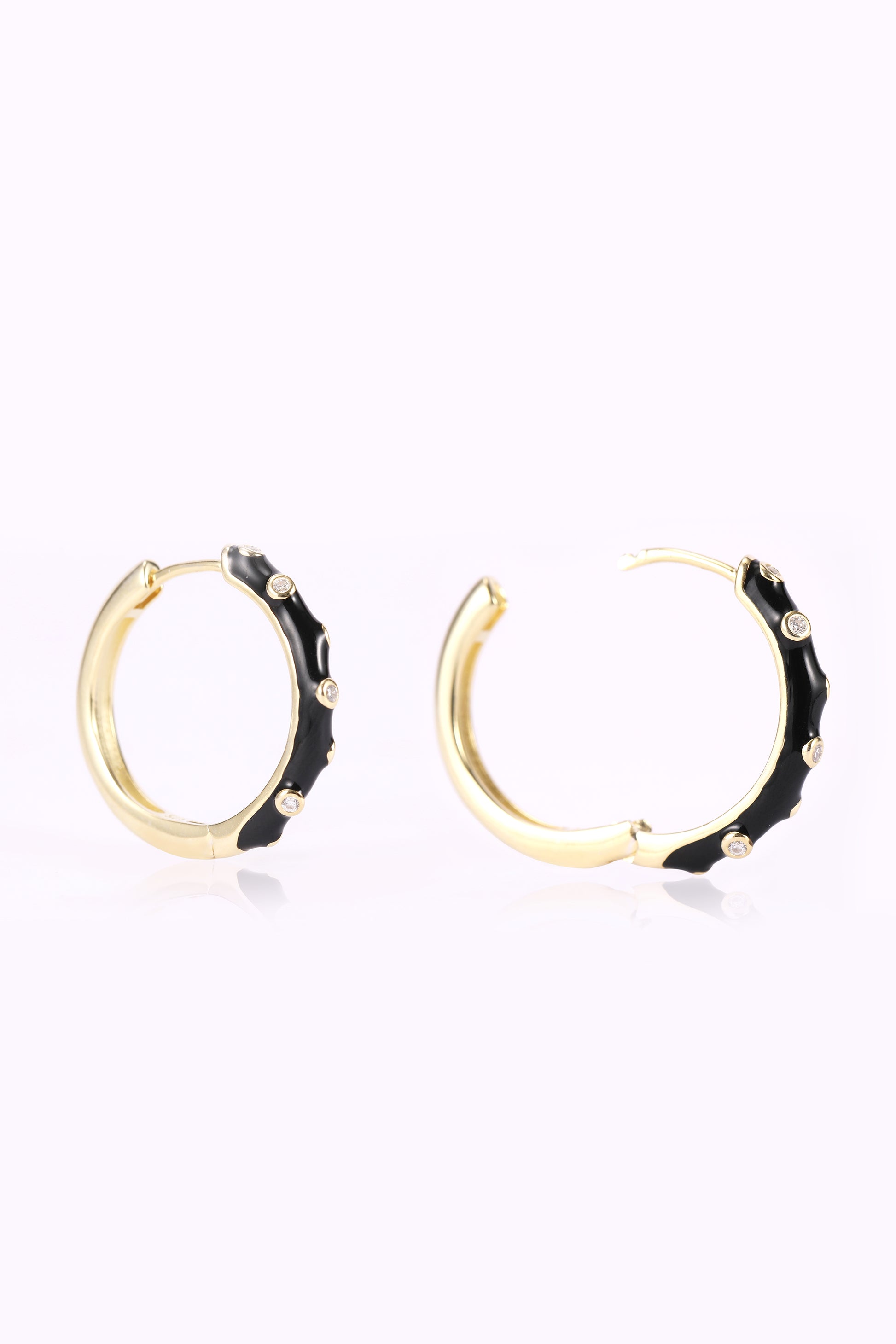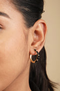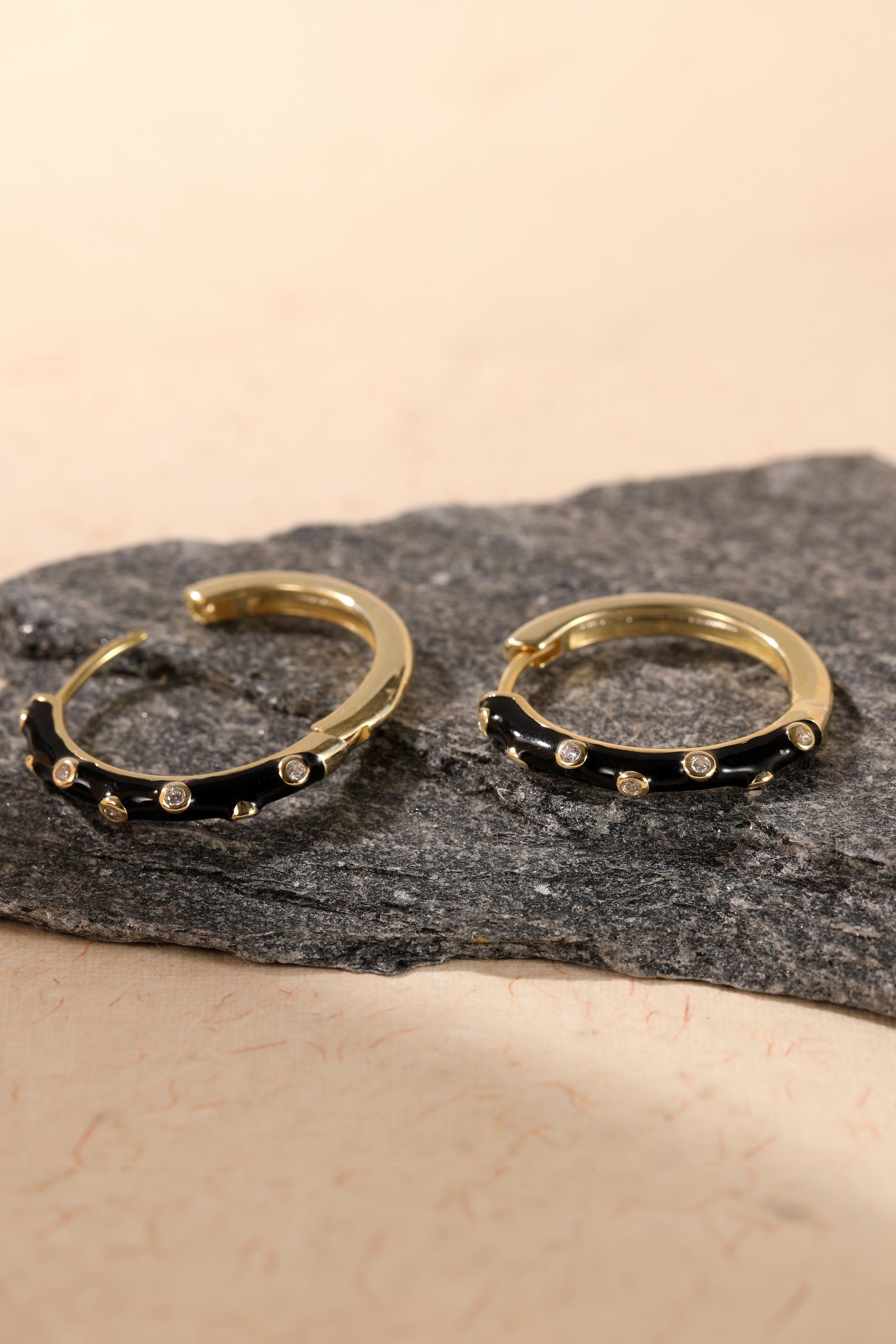 Styling Tip- Create a bold contrast with "Midnight Marvel" black enamel hoops. Pair them with an all-white outfit to make a striking fashion statement, highlighting the gold accents beautifully.