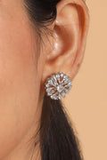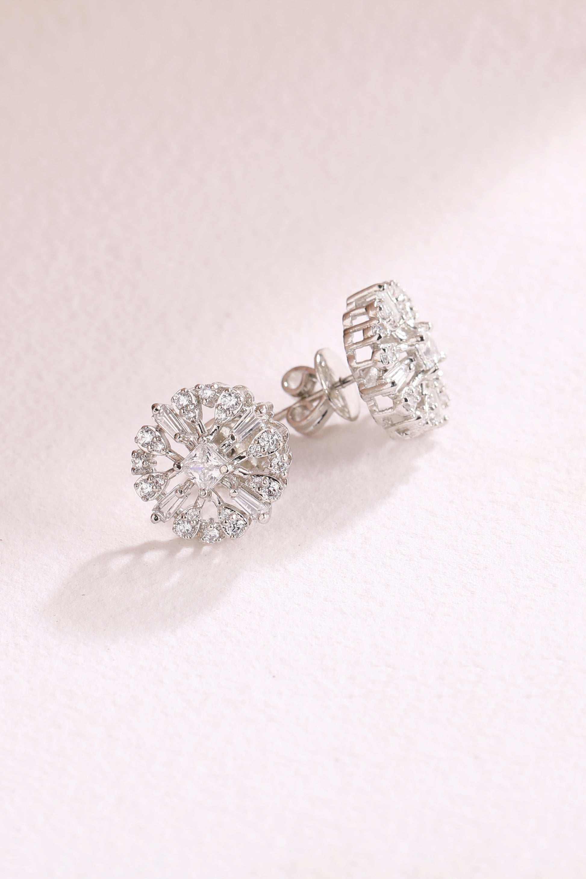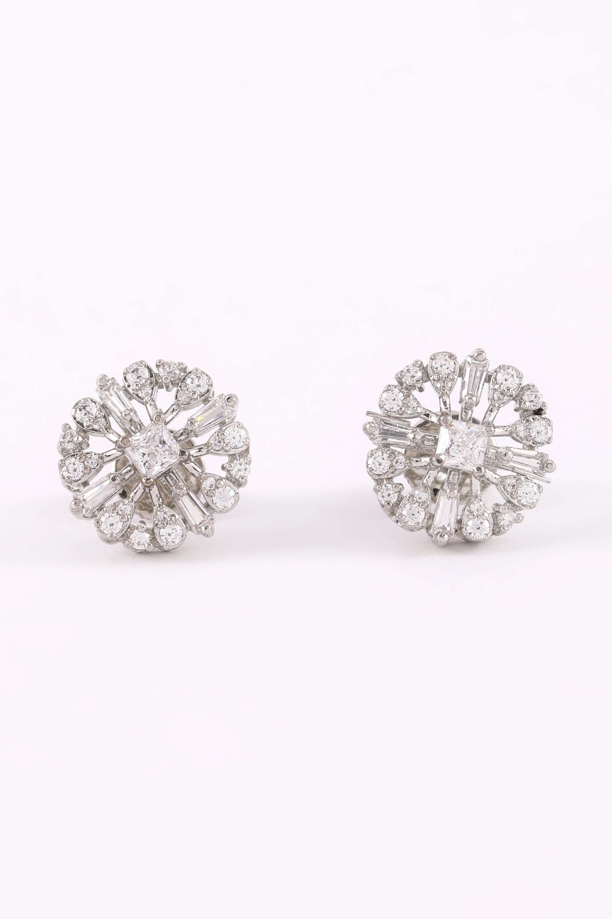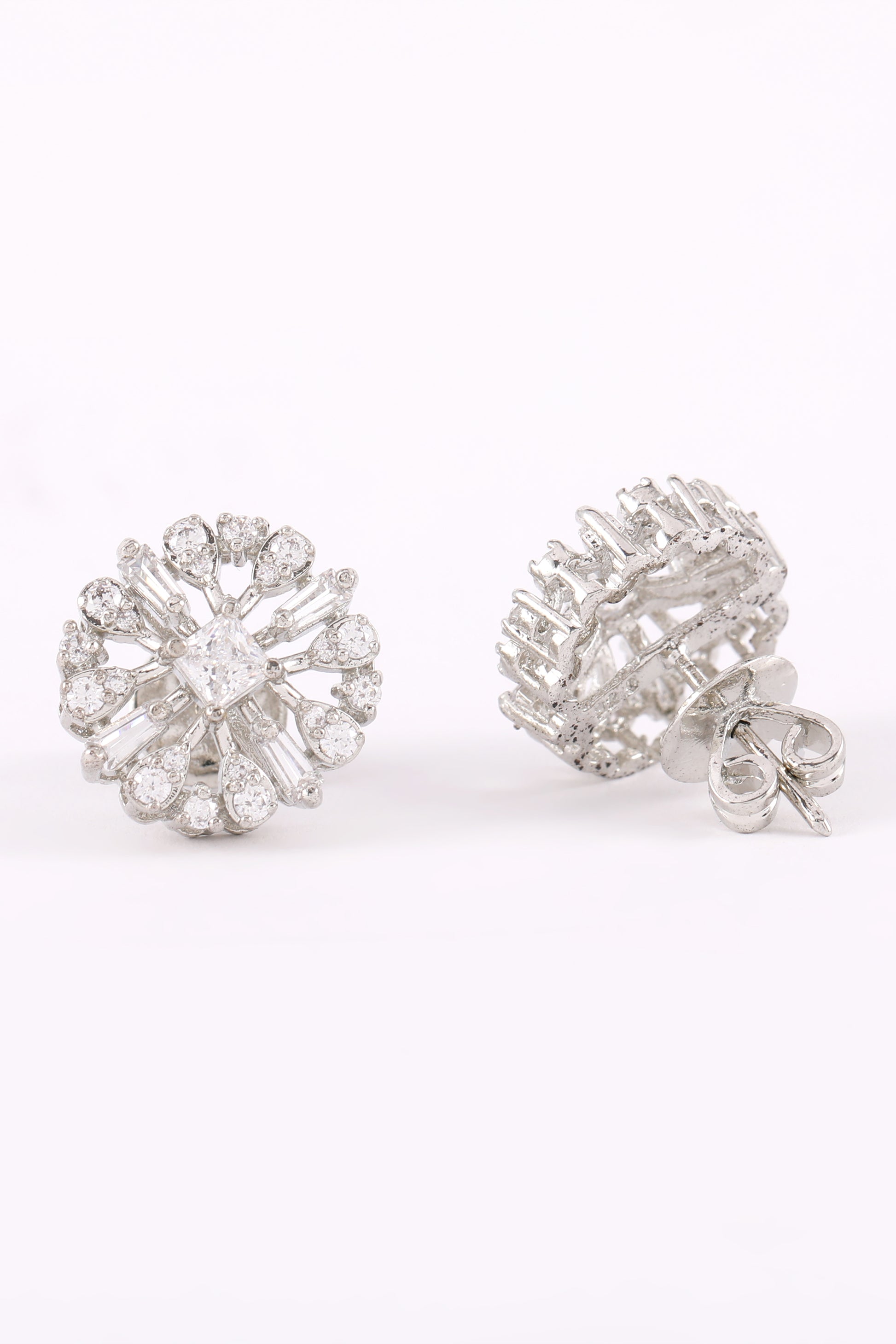 This stunning sterling silver jewelry piece showcases a captivating princess-cut stone at its center, radiating elegance and brilliance. Surrounding the centerpiece are four sleek baguette-cut stones, arranged to enhance its sparkle. Completing the design, pear-shaped stones are artfully positioned in a circular pattern, creating a harmonious and luxurious aesthetic.