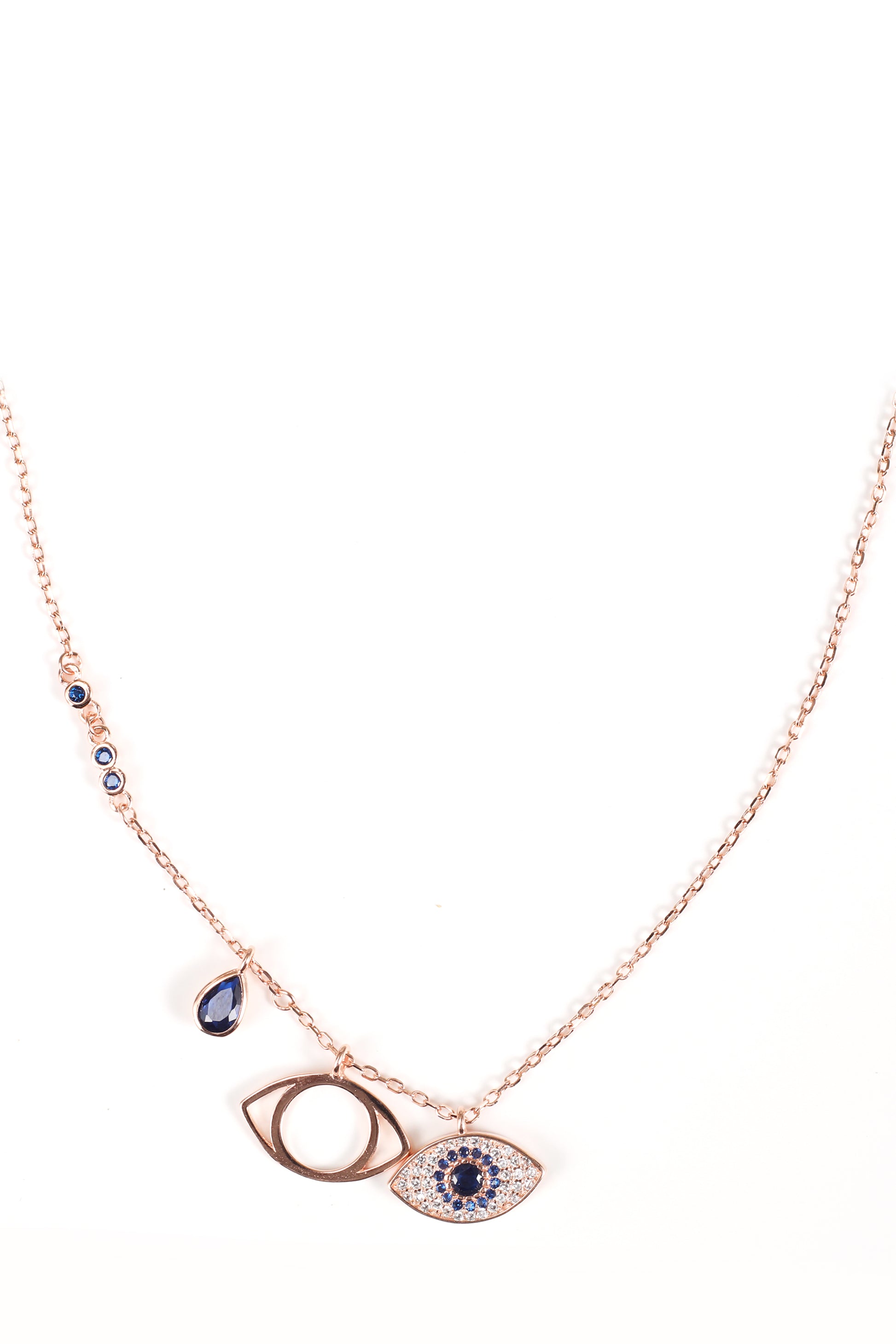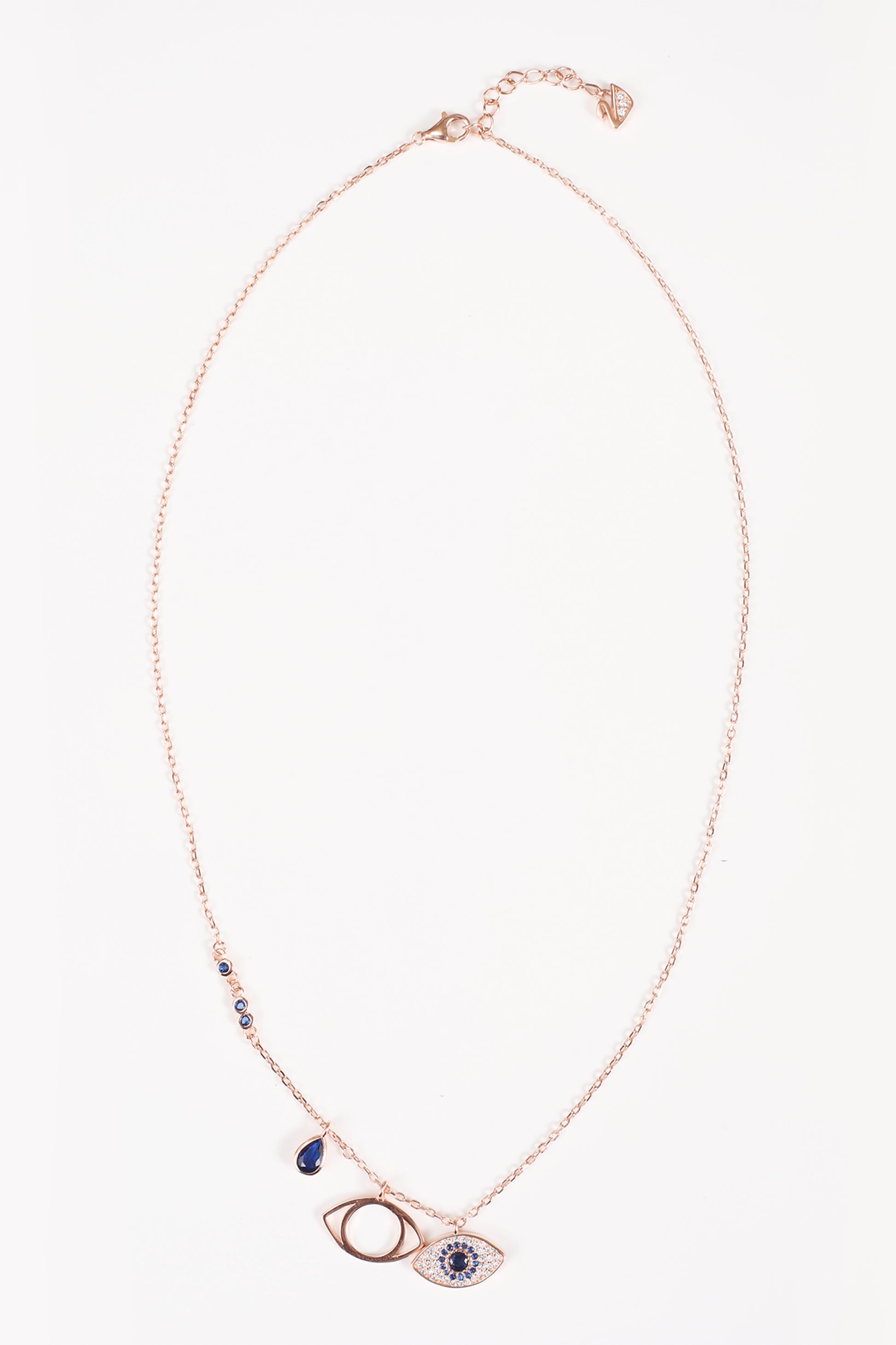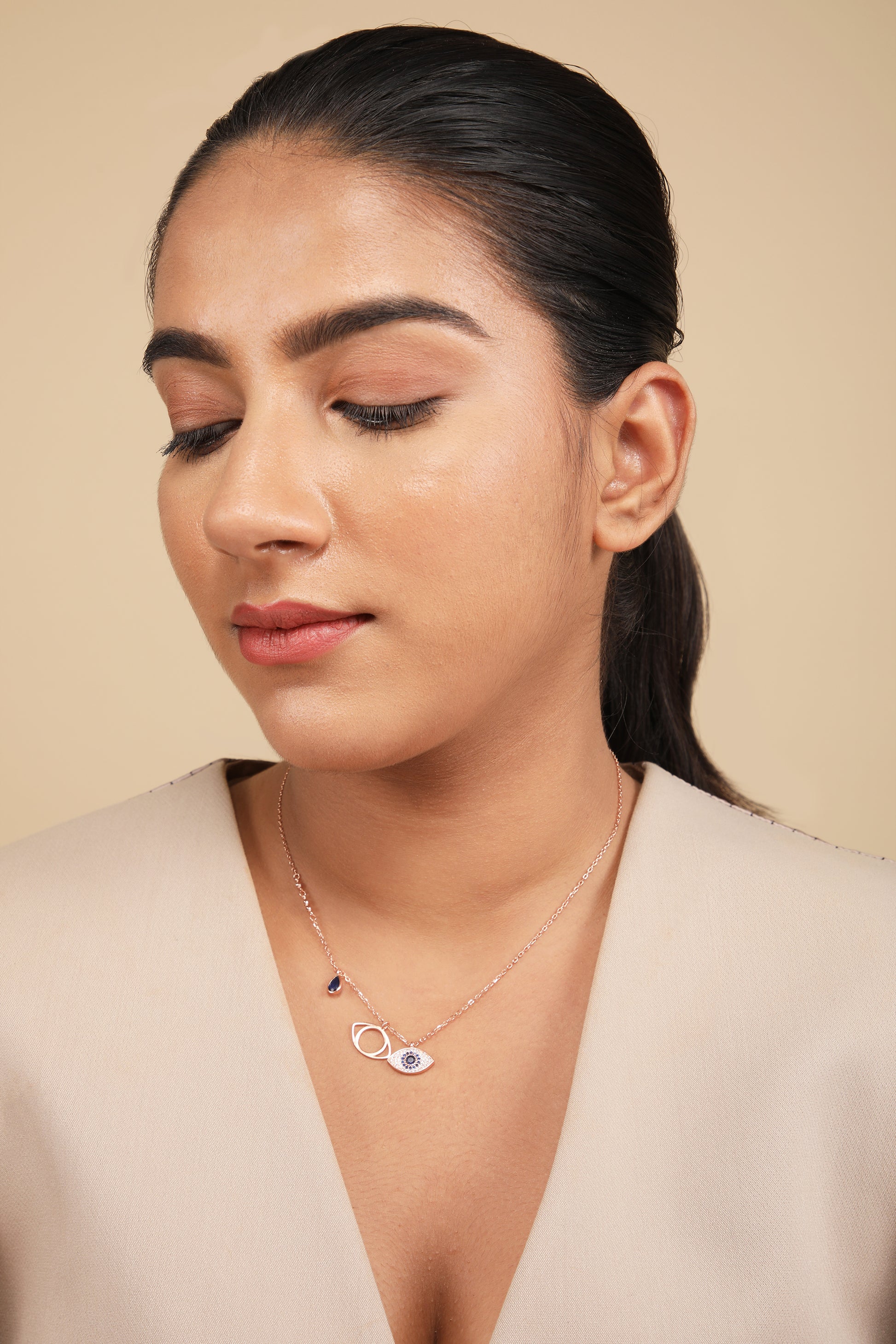 Elegantly crafted in sterling silver with a captivating rose gold polish, our Evil Eye Pendant features a hollow eye charm, adorned with a stunning blue charm. This pendant embodies timeless beauty and mystical protection.