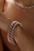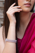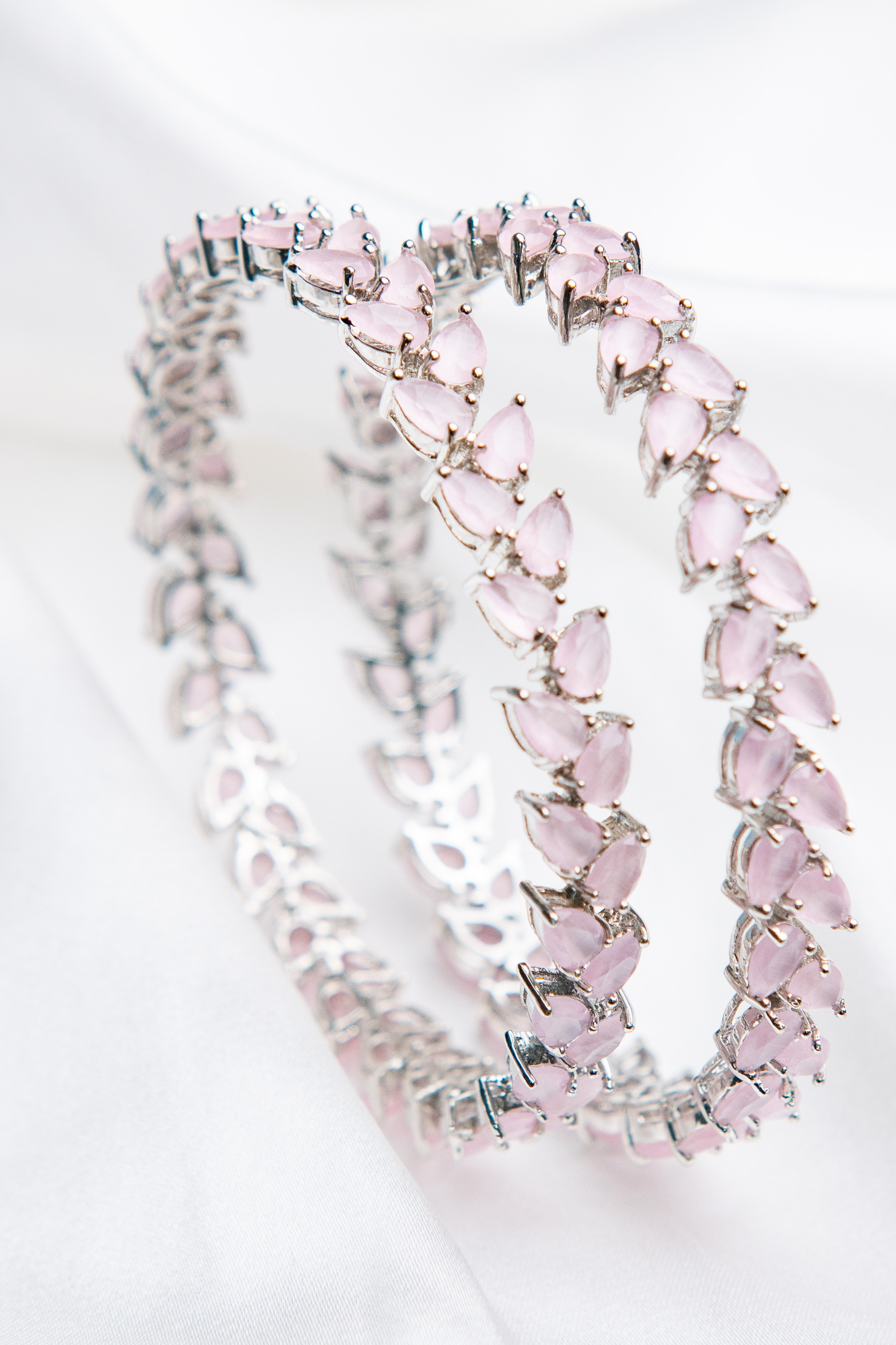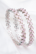Styling Tip- The alternating placement of high-quality pink crystals creates a stunning leafy design that is both timeless and contemporary. Elevate your style with these exquisite bangles that offer a touch of sophistication and elegance to any outfit.