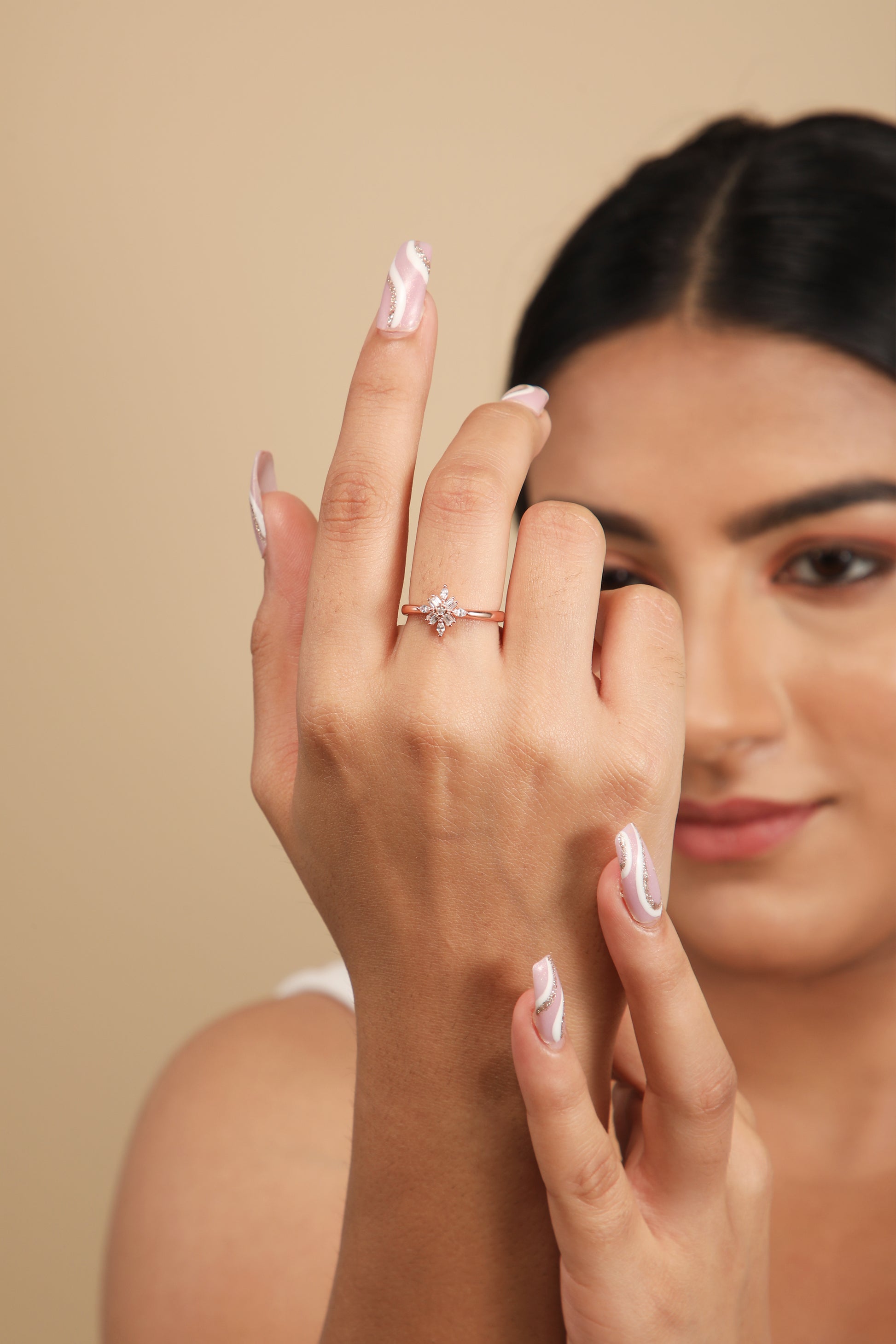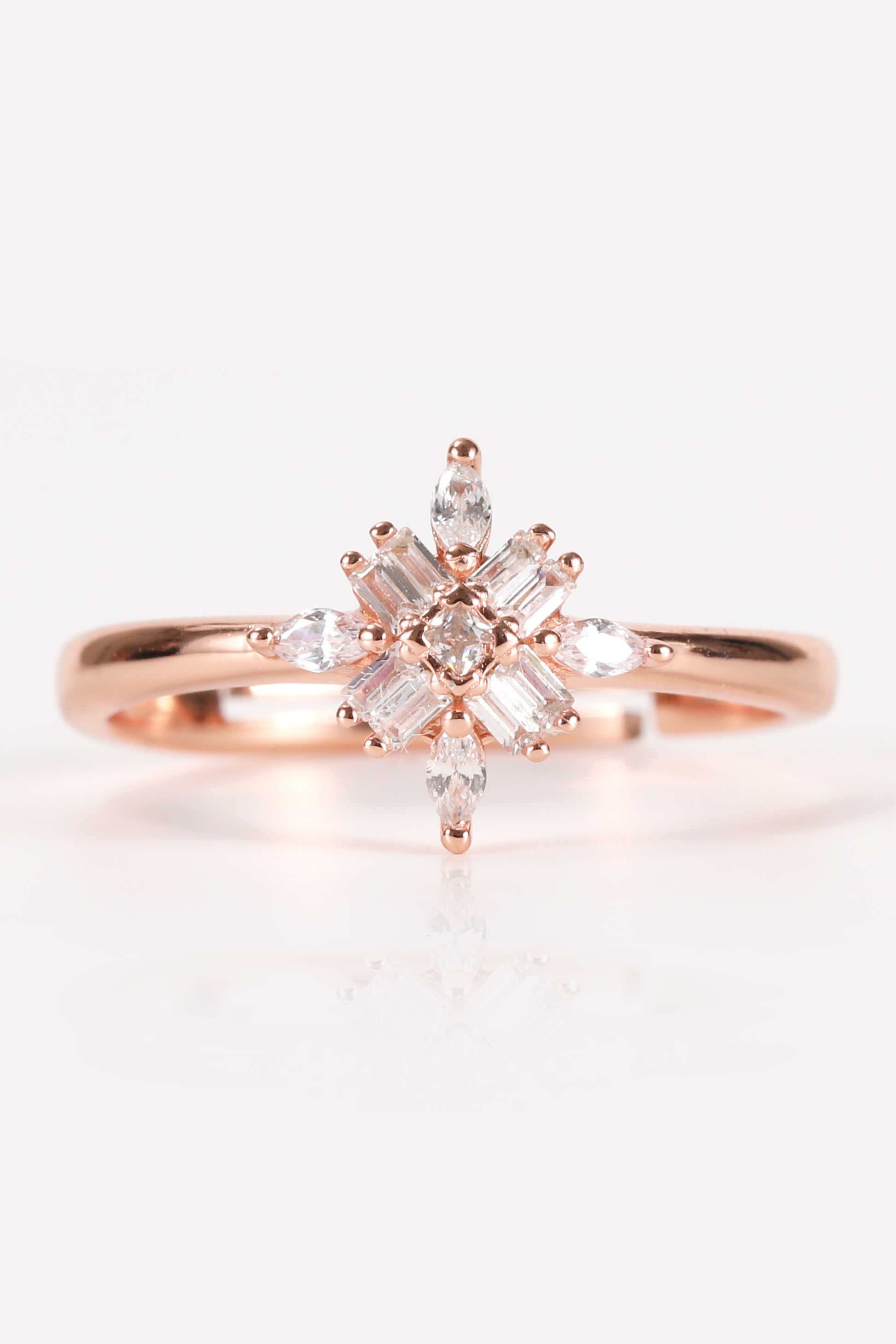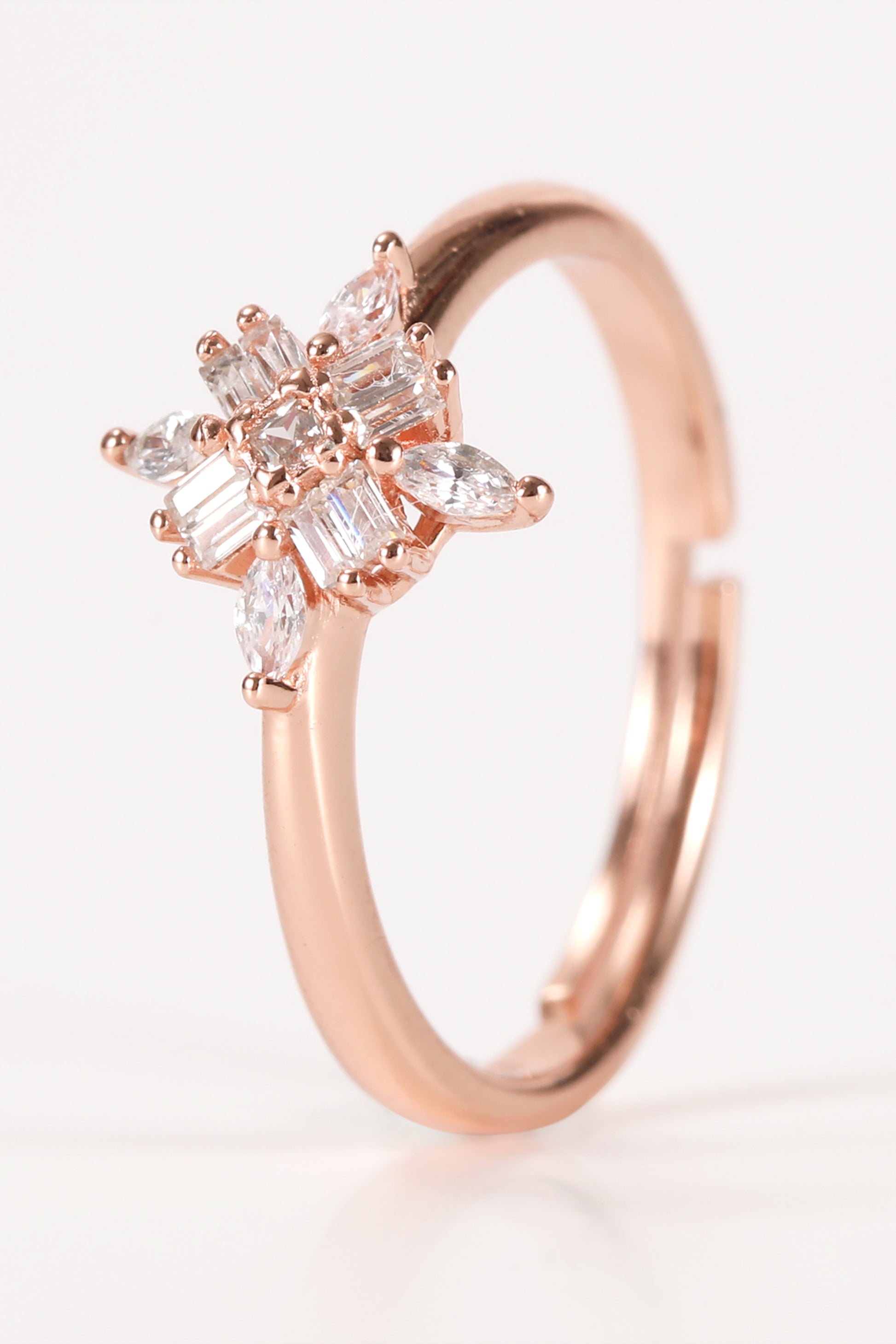 Adorn your finger with our exquisite Floral Silver Ring in rose gold. A stunning starburst pattern of baguette and marquise crystals creates a radiant bloom of timeless elegance. Its adjustable size ensures a perfect fit for every wearer.