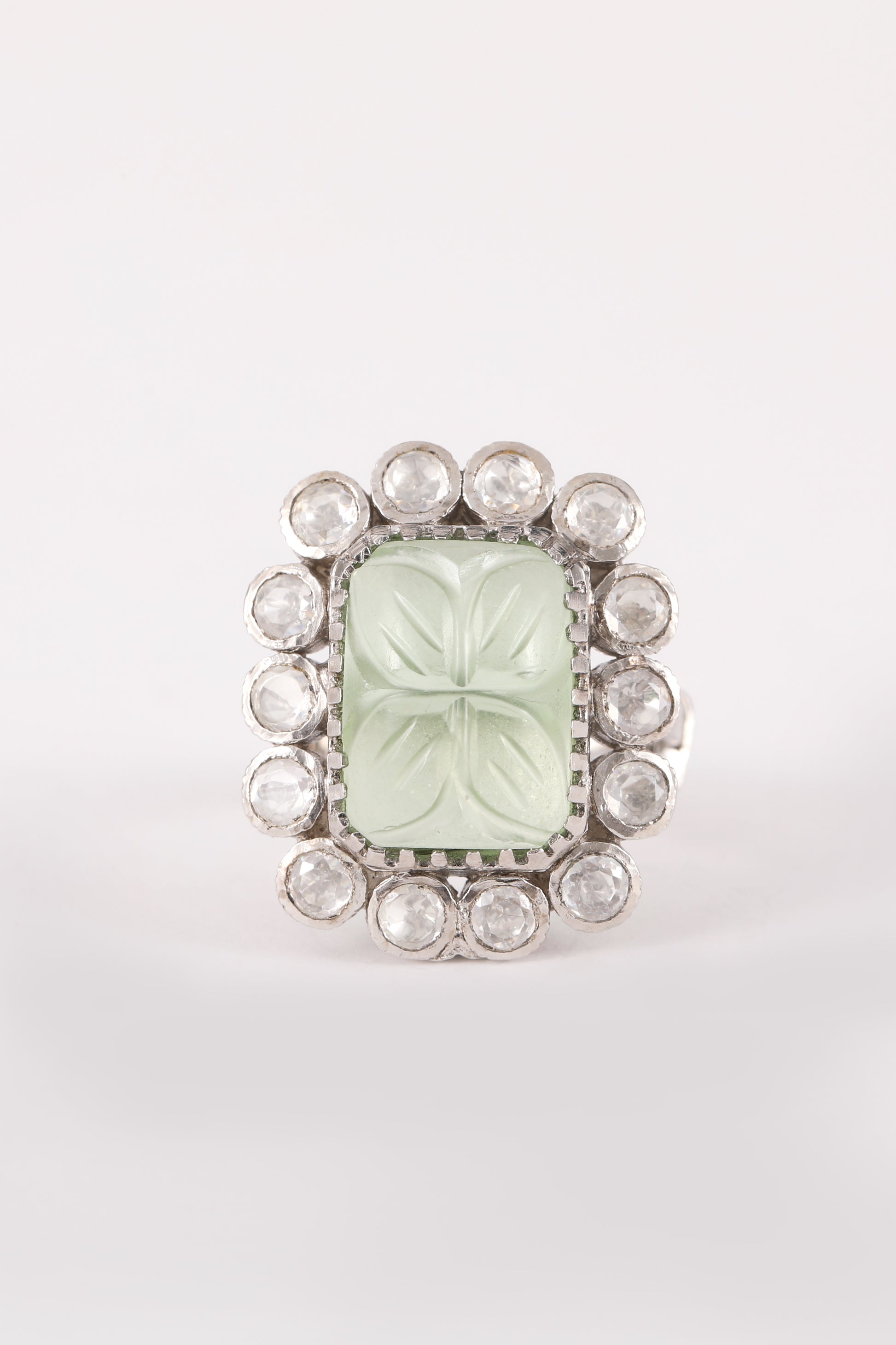 Elevate your style with the 'Sage' silver ring, featuring a stunning carved green stone. A perfect blend of traditional and boho aesthetics, ideal for any occasion, from casual to formal.