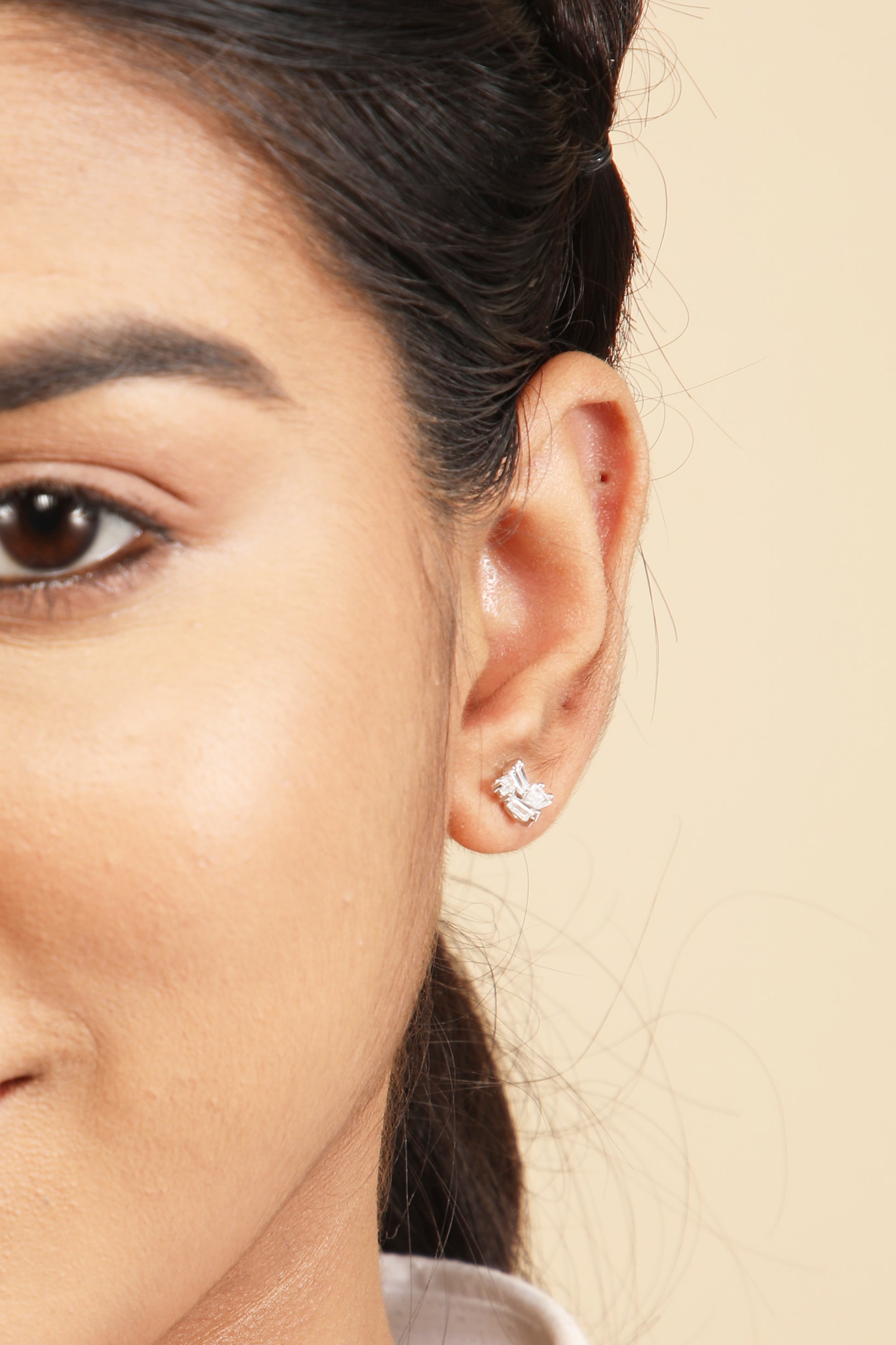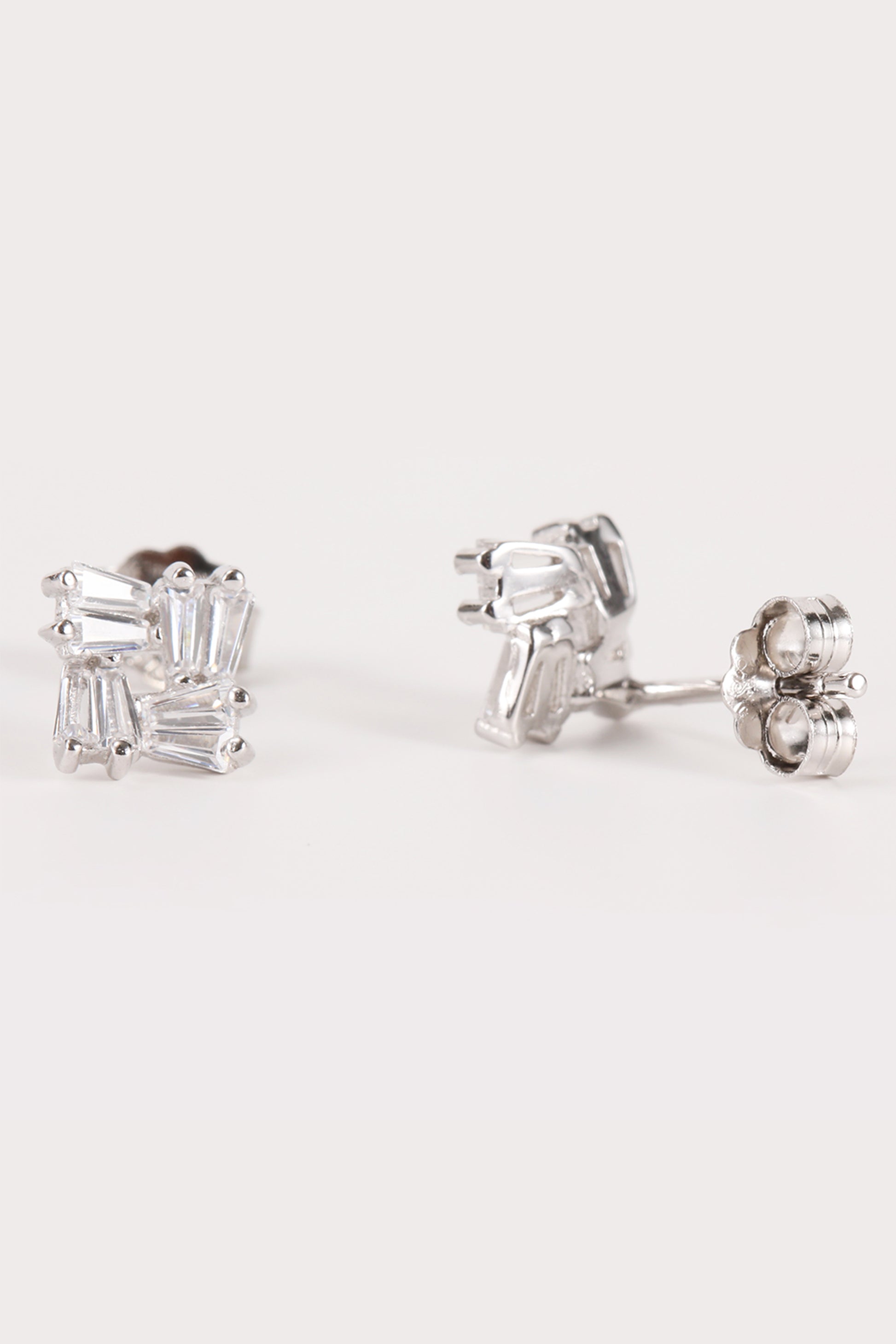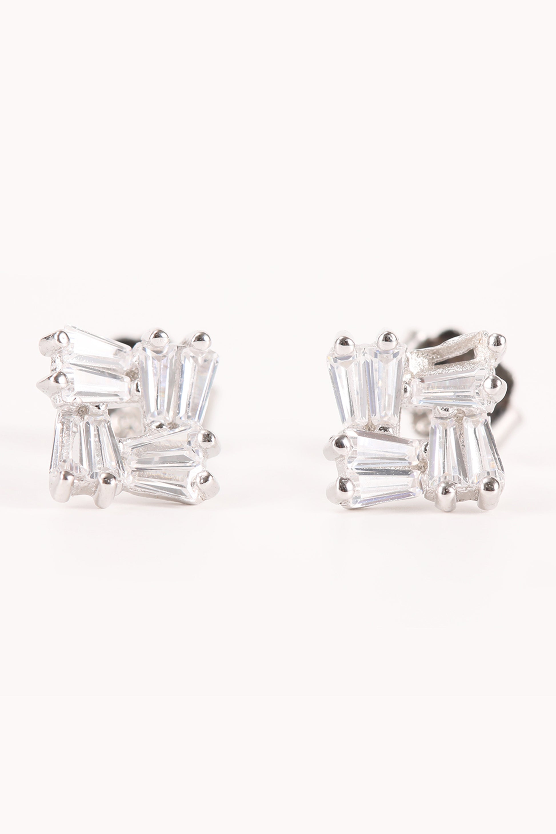 Introducing "Bella": A sleek silver earring, expertly crafted into a square shape with dazzling baguette details. Elegance meets modernity in this timeless accessory.