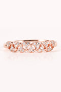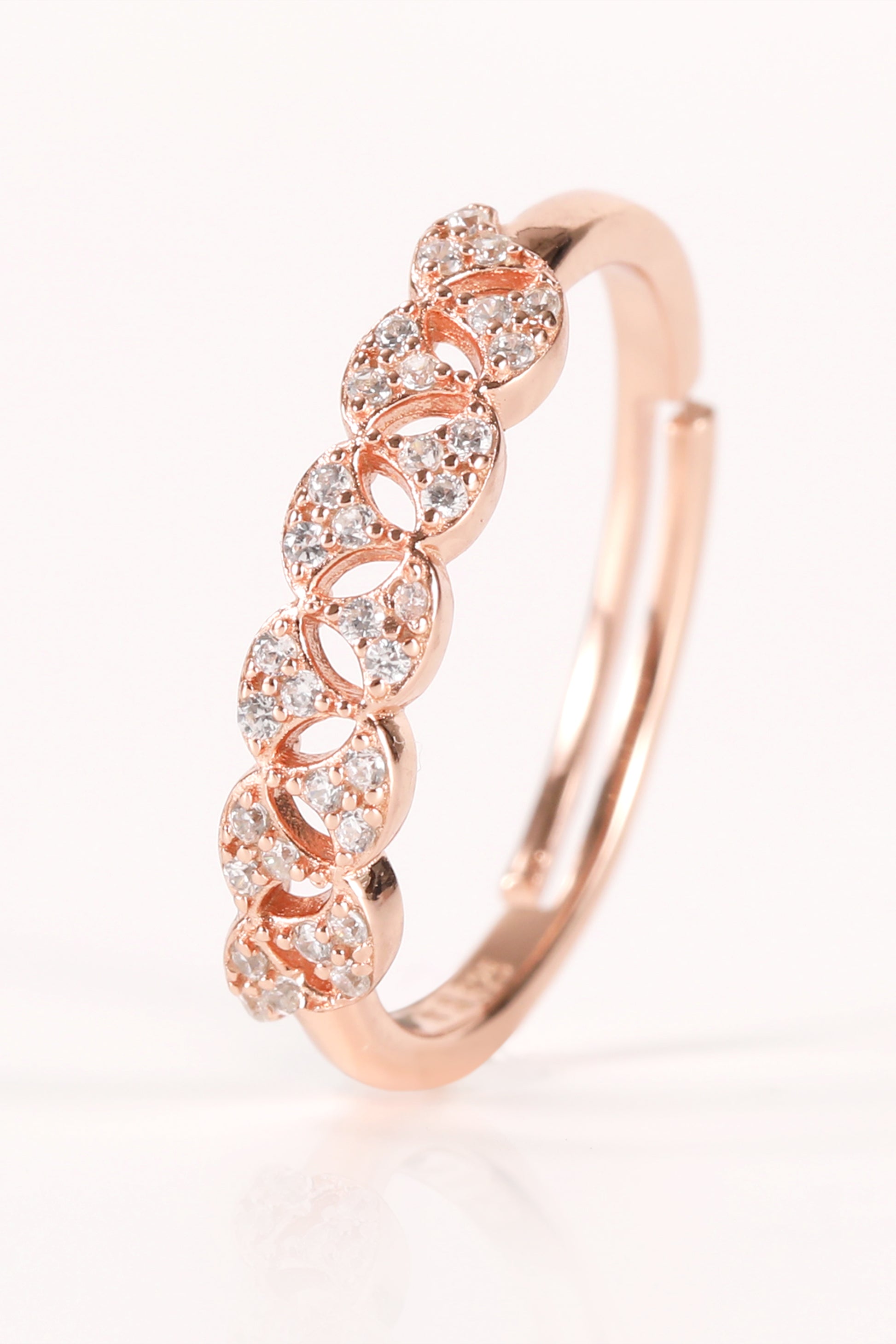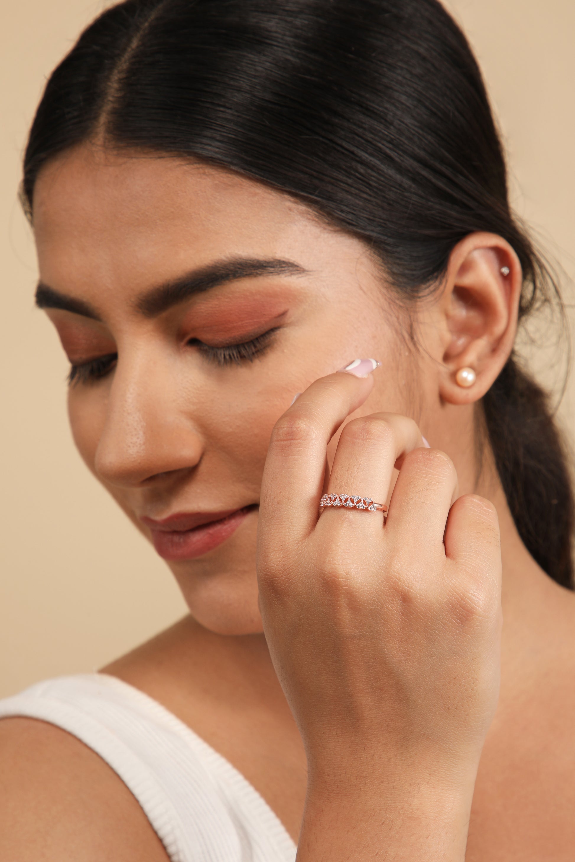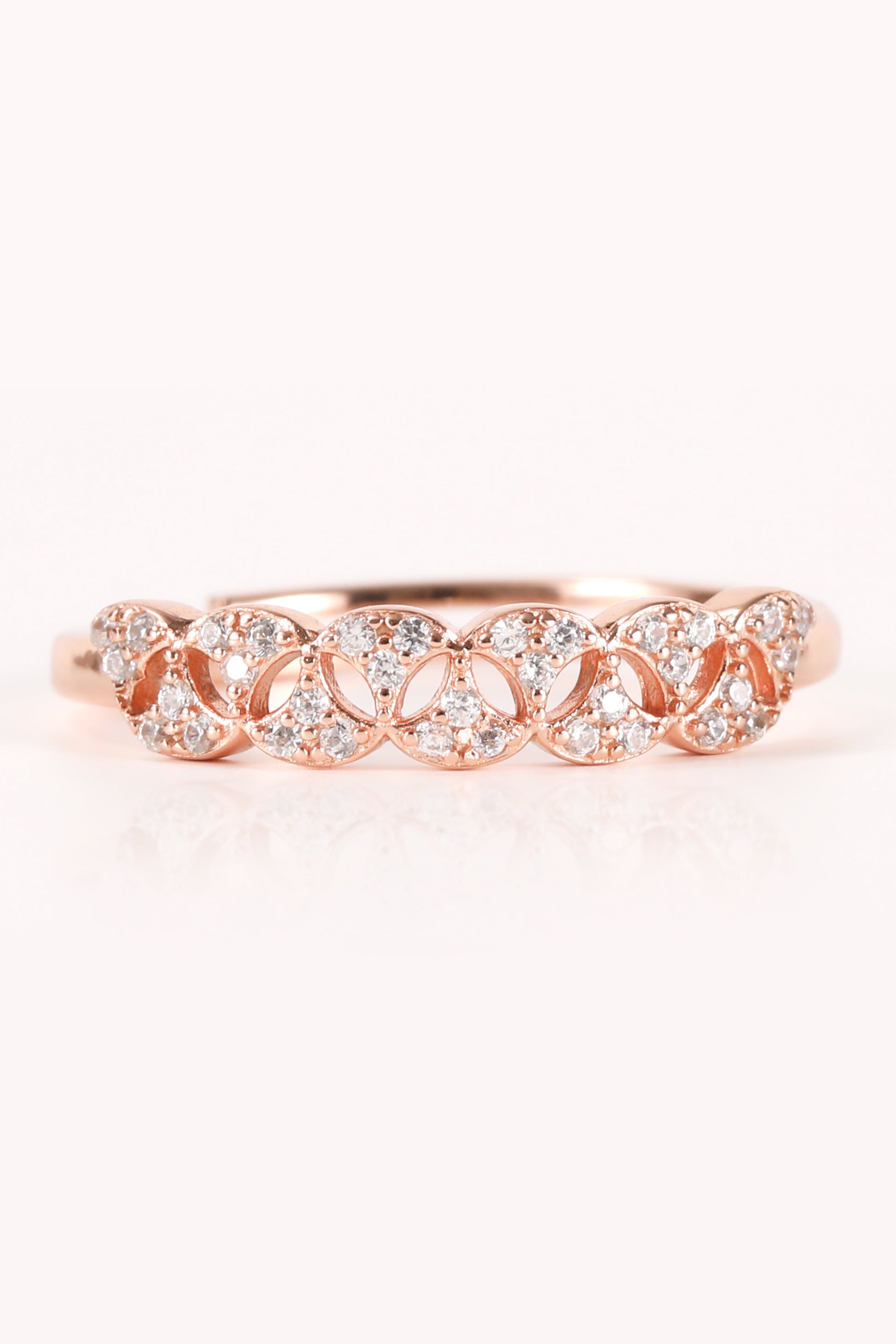 Elegant silver band ring with interlocking triangular elements, radiating modern charm in a captivating rose gold hue. Perfect for chic and sophisticated style.