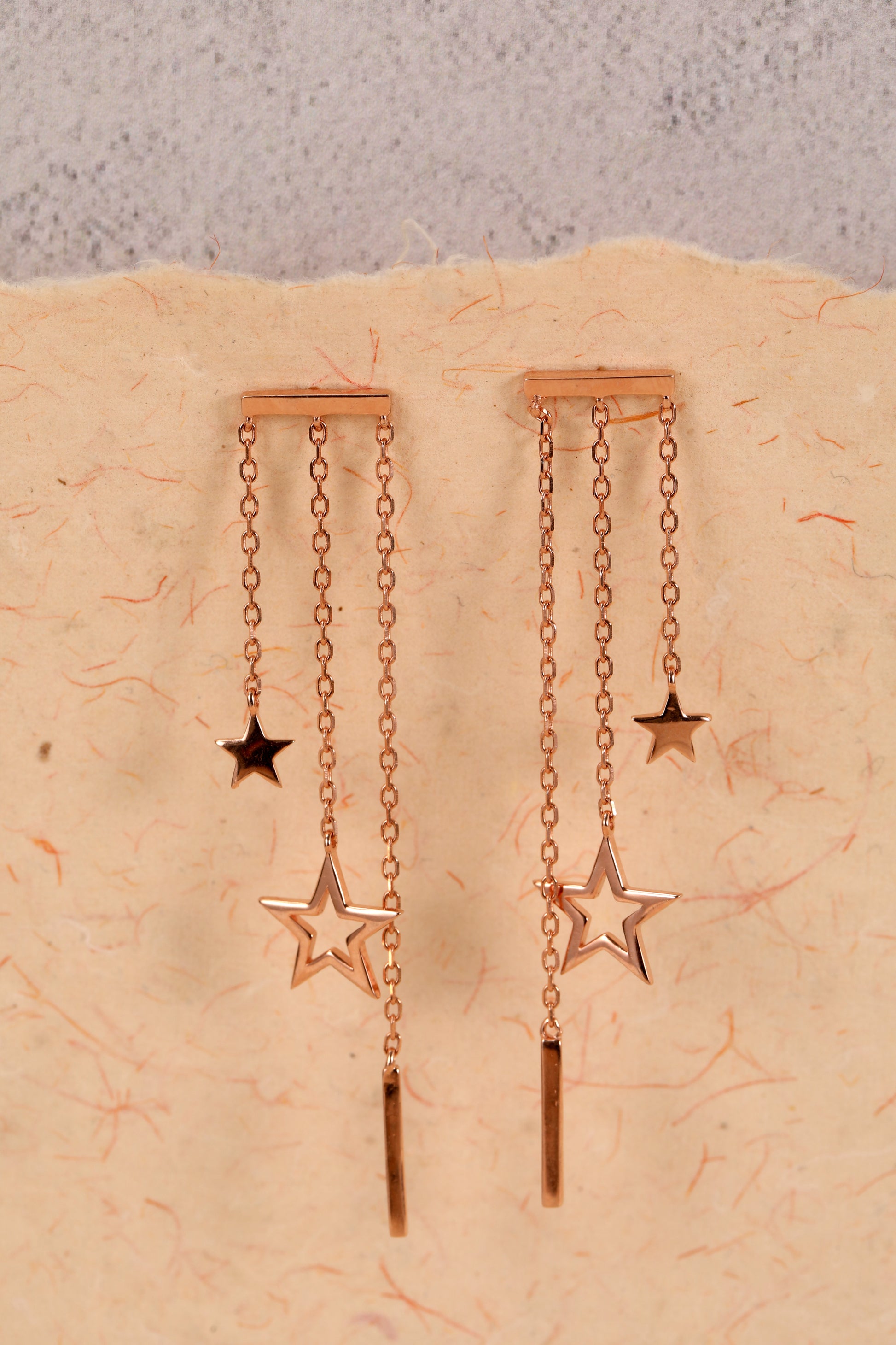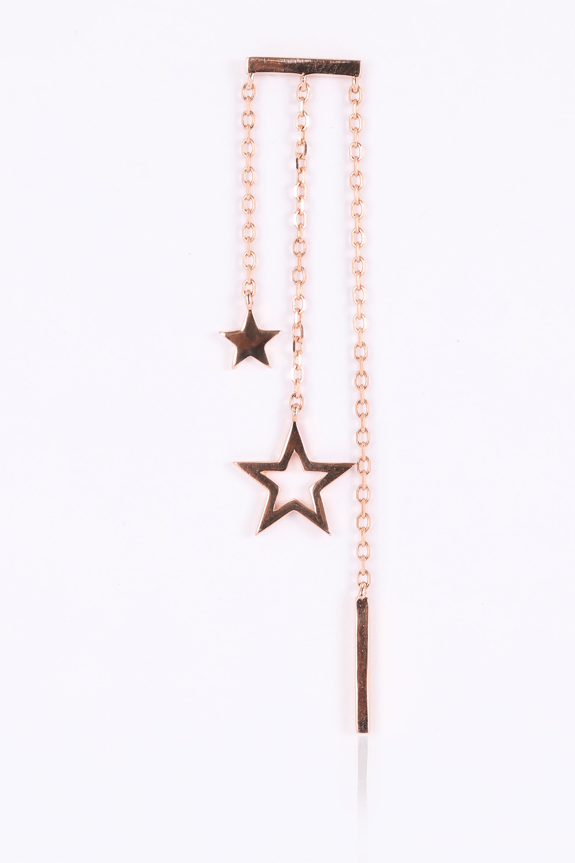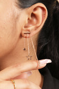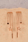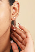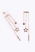 Elevate your style with our "Triple Starlight" earrings, inspired by Korean fashion. Three stars dangle gracefully from a silver line, adorned with a radiant rose gold polish for a touch of glamour.