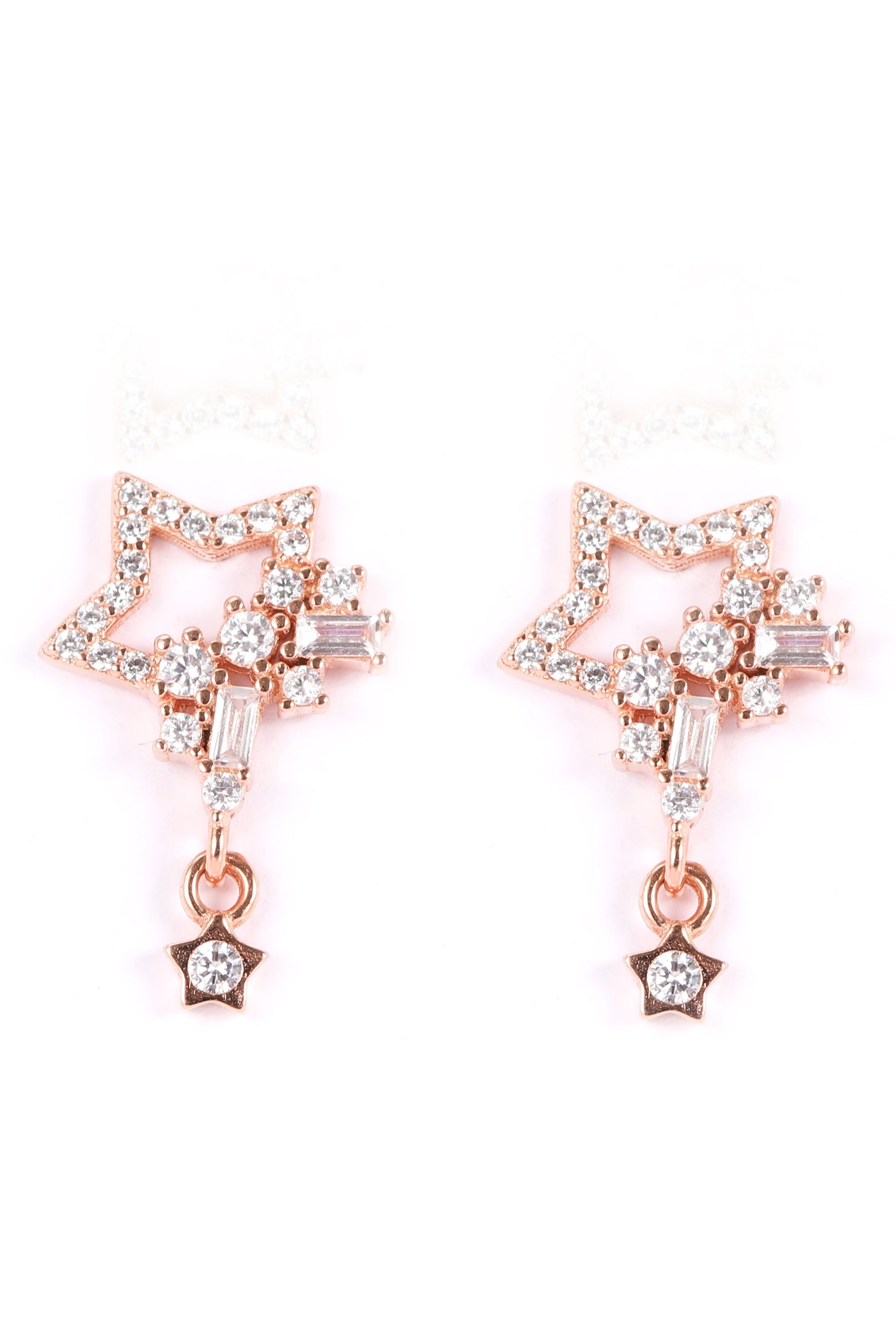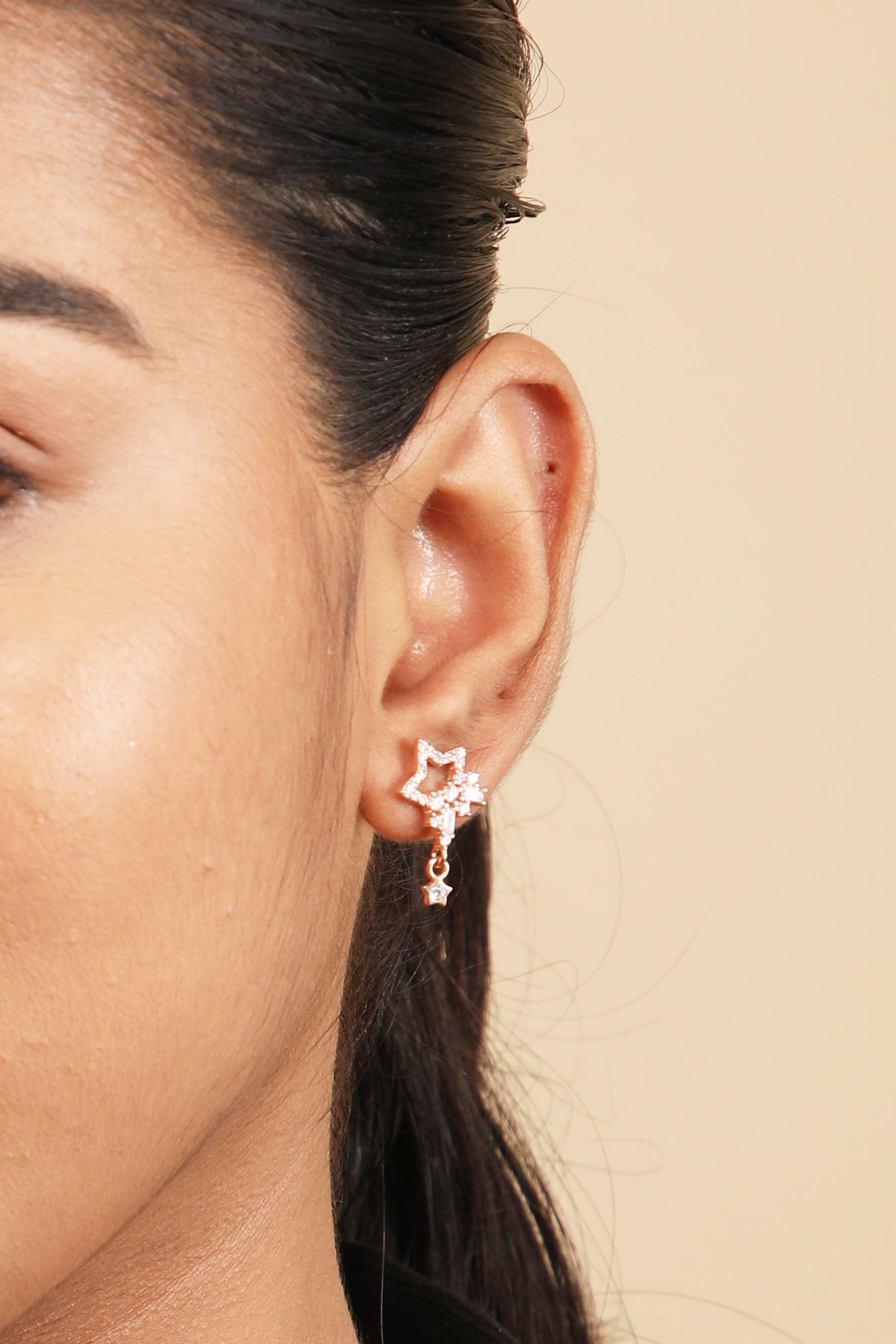 Styling Tip- Elevate your girly charm with "Twinkle Tale" silver earrings in a rose gold finish. Pair them with pastel dresses or floral prints for a sweet, romantic look that's perfect for a soft, feminine vibe.